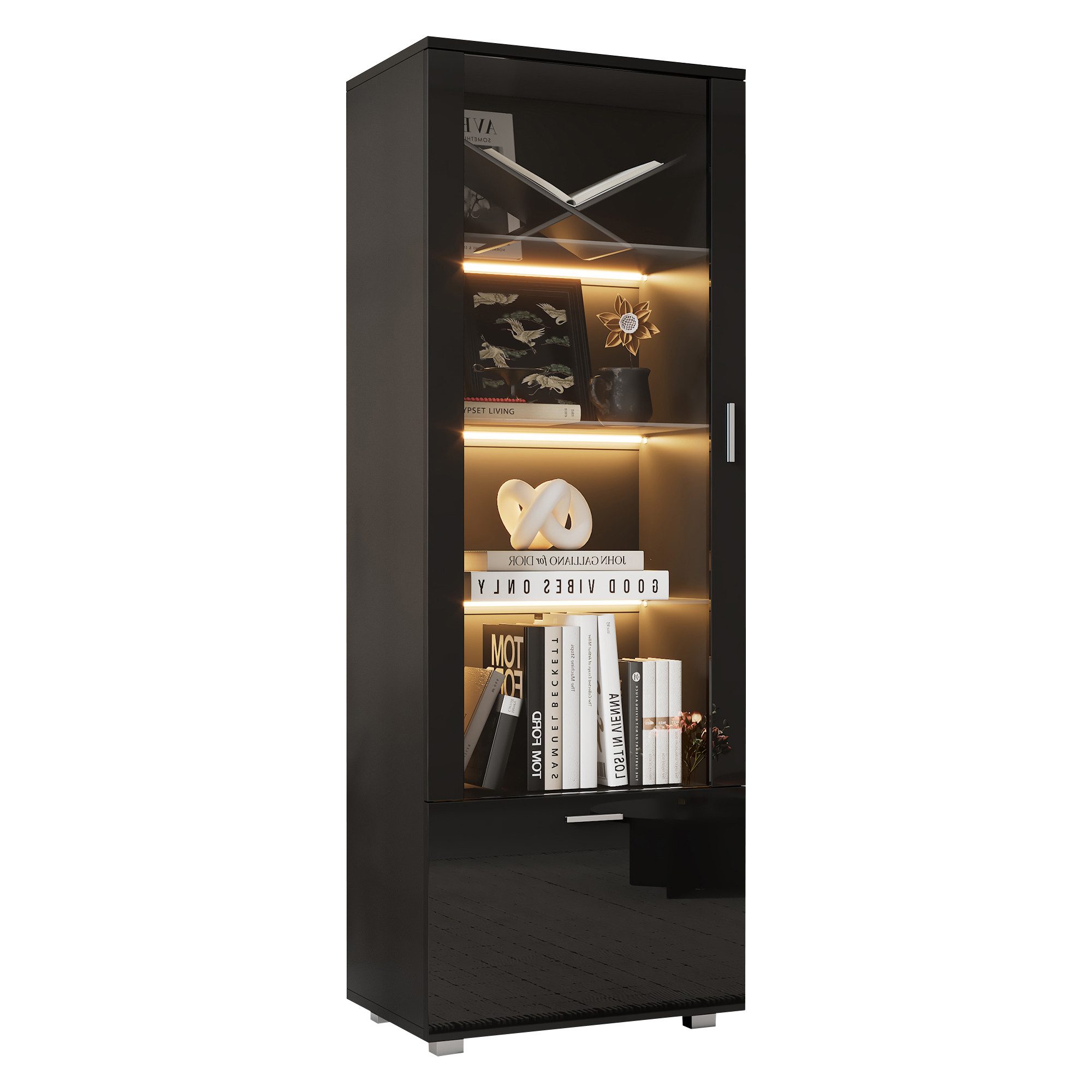 Schwarze Hochglanzvitrinen mit Glastüren, LED-beleuchtete Glasvitrinen, Vitrinen für Sammlerstücke, Parfümschränke, Bücherregale und Glasvitrinen mit schwarzen Hochglanztüren (3 Fachböden)