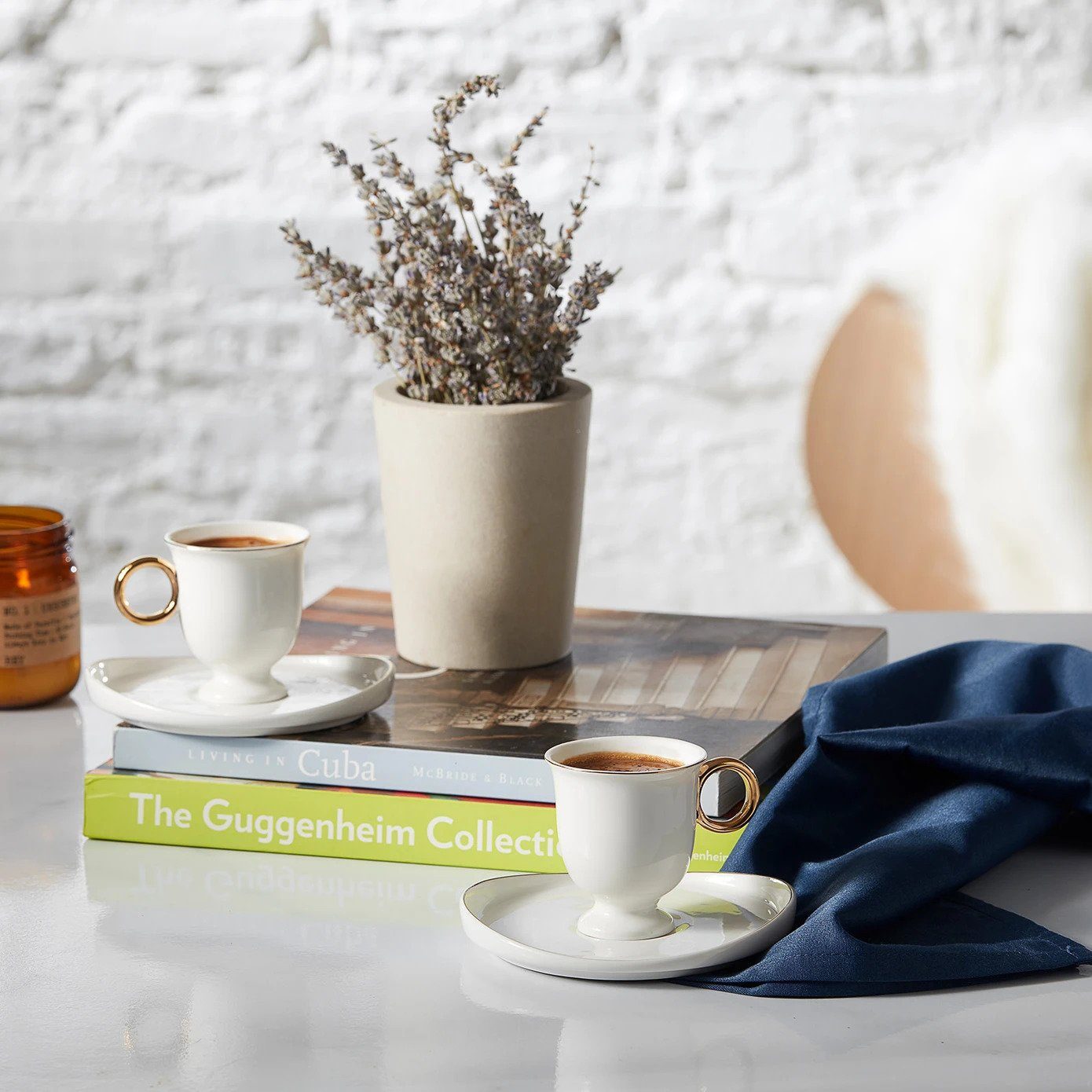 Karaca Mum Espresso Set für 6 Personen, Porzellantasse 6er Set für Gastro & Haushalt, 12 Teiliges Espressotassen-Set, Kaffee Becher, Gold umrandet 90 ml