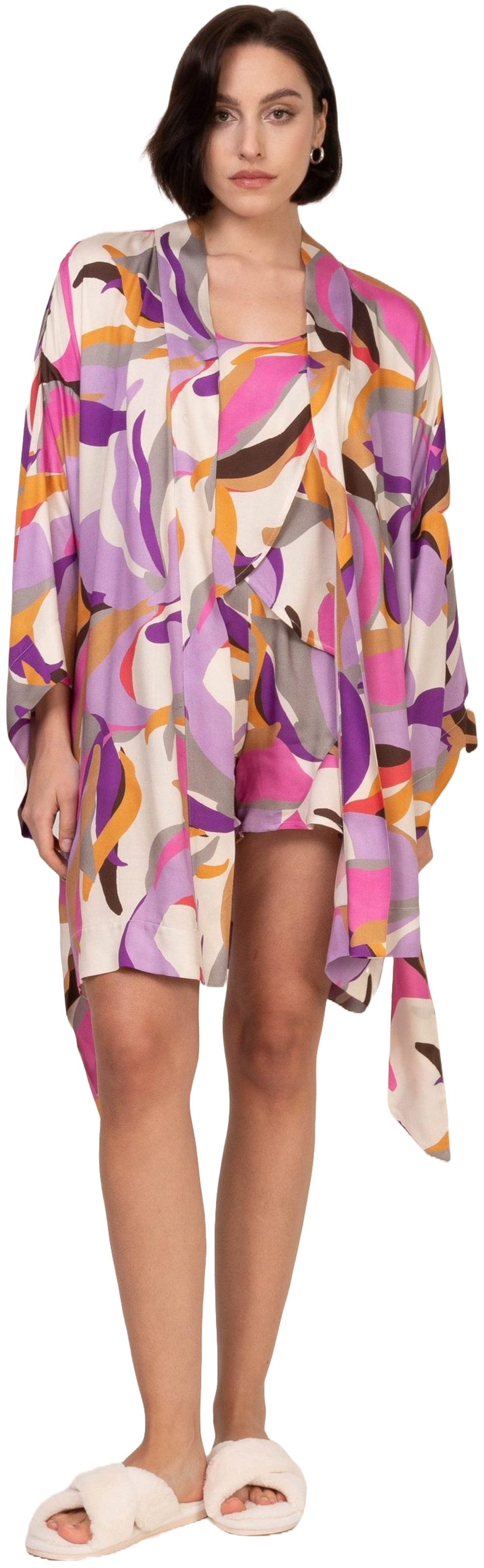 Wir präsentieren den OH!ZUZA Damen Kimono. Der die Eleganz eines klassischen Kimonos mit der Originalität eines modernen, abstrakten Drucks verbindet. Dies ist ein ideales Angebot für Frauen, die sowohl Wert auf Komfort als auch auf einzigartigen Stil legen. Material: 100% Viskose. Aus luftigem Viskosestoff gefertigt, bietet es maximalen Komfort und Leichtigkeit und ist perfekt für jede Jahreszeit. Ein moderner, abstrakter Druck, der Lila-, Rosa-, Orange- und Grautöne kombiniert. Dieses große, farbenfrohe Muster verleiht dem Kimono einen einzigartigen Charakter und macht es zu einem einzigartigen Kleidungsstück. Um die Schönheit und Qualität Ihres Viskoseprodukts zu erhalten, bedarf es einer sanften Pflege. Es wird empfohlen, bei 30 Grad zu waschen, ohne zu schleudern und mit Dampf zu bügeln. Nicht bleichen, nicht mechanisch trocknen, nicht chemisch reinigen. Wählen Sie am besten Waschmittel, die für empfindliche Stoffe geeignet sind.