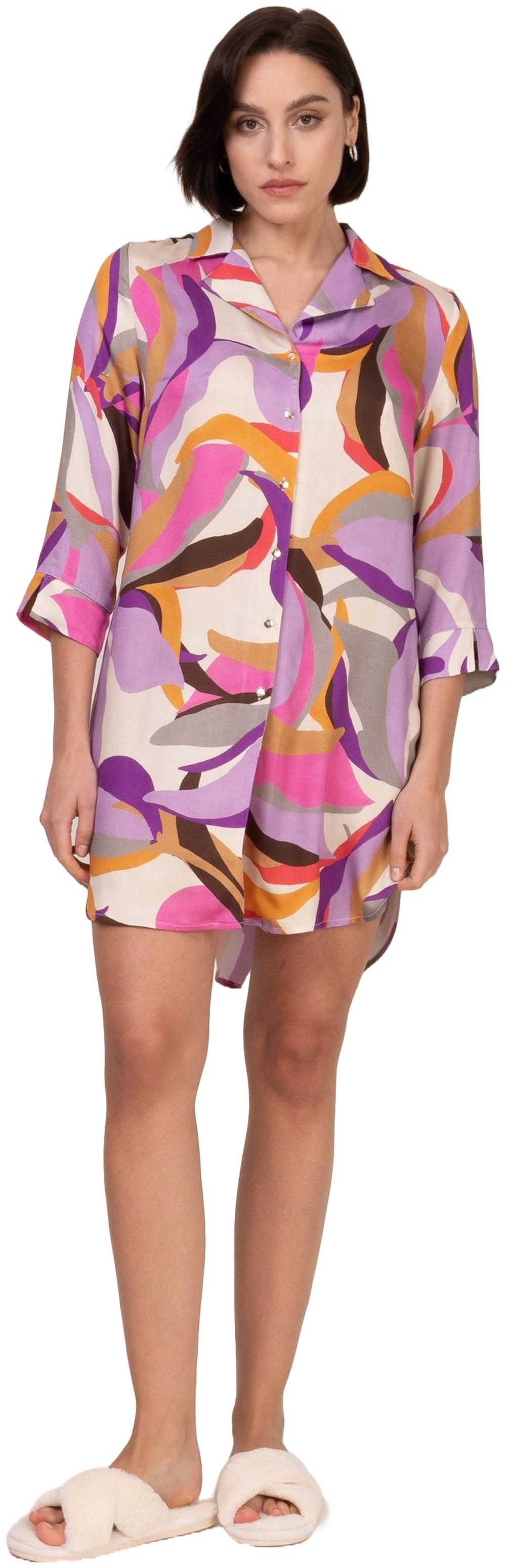 Wir präsentieren das OH!ZUZA Damen Nachthemd, das die Eleganz eines klassischen Hemdes mit der Originalität eines modernen, abstrakten Drucks verbindet. Dies ist ein ideales Angebot für Frauen, die sowohl Wert auf Komfort als auch auf einzigartigen Stil legen. Aus luftigem Viskosestoff gefertigt, bietet es maximalen Komfort und Leichtigkeit und ist perfekt für jede Jahreszeit. Ein moderner, abstrakter Druck, der Lila-, Rosa-, Orange- und Grautöne kombiniert. Dieses große, farbenfrohe Muster verleiht dem Shirt einen einzigartigen Charakter und macht es zu einem einzigartigen Kleidungsstück. Klassischer Schnitt mit Kragen, perfekt zum Schlafen und für den täglichen Gebrauch. Die 3/4-Ärmel sind mit geschlitzten Manschetten versehen, die für Eleganz und Raffinesse sorgen. Das Hemd wird mit Knöpfen geschlossen, was das An- und Ausziehen erleichtert. Die Длина bis zur Mitte des Oberschenkels vorne und der abgerundete Saum, der hinten verlängert ist, sorgen für einen modischen und bequemen Schnitt. Um die Schönheit und Qualität Ihres Viskoseprodukts zu erhalten, bedarf es einer sanften Pflege. Es wird empfohlen, bei 30 Grad zu waschen, ohne zu schleudern und mit Dampf zu bügeln. Nicht bleichen, nicht mechanisch trocknen, nicht chemisch reinigen. Wählen Sie am besten Waschmittel, die für empfindliche Stoffe geeignet sind.