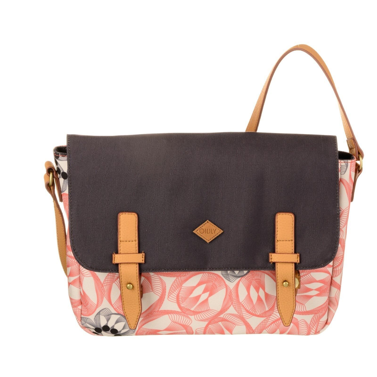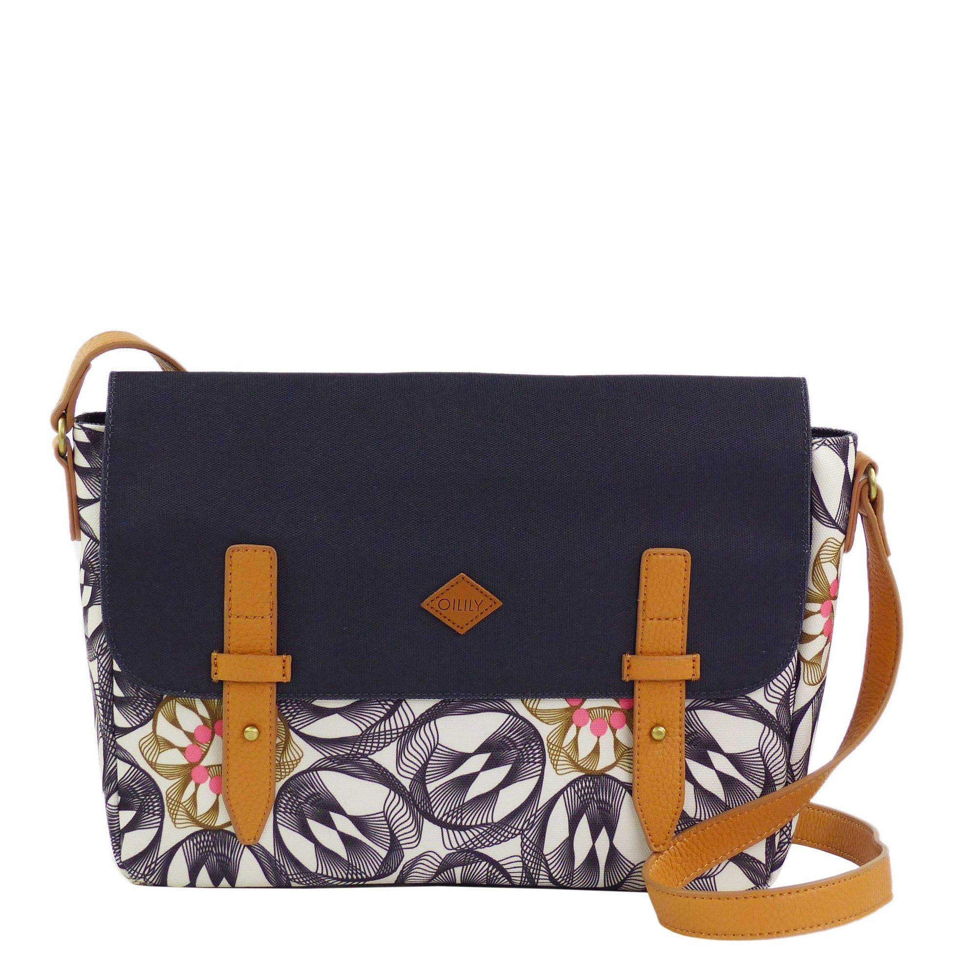 Stilvolle Umhängetasche von Oilily aus robustem Material mit Kunstlederbesätze. Der einfarbige Hintergrund dient als Kontrast zu den verflochtenen Linien, aus der Ferne betrachtet wirkt das schillernde Muster wie eine auffallende Blumenform