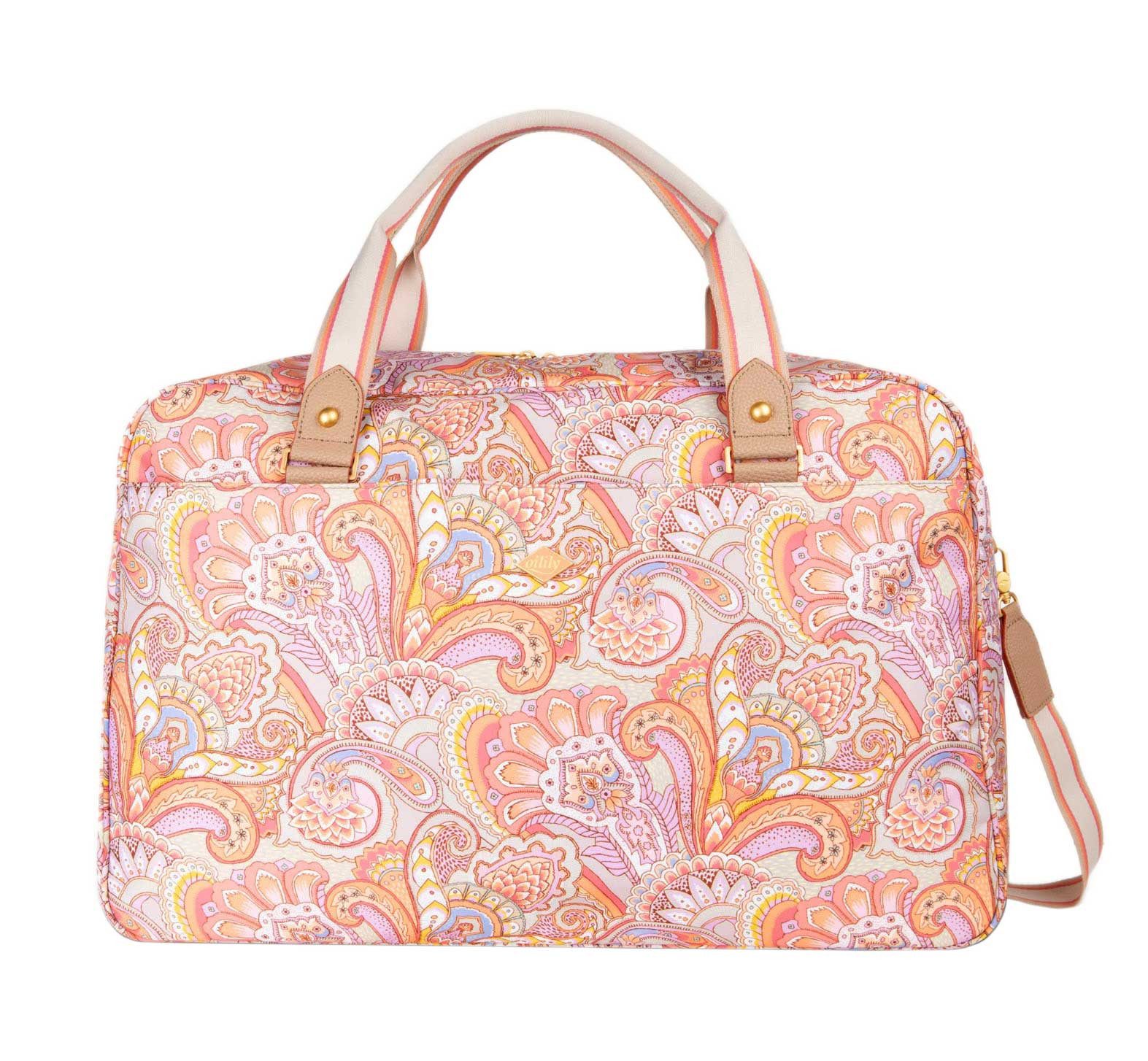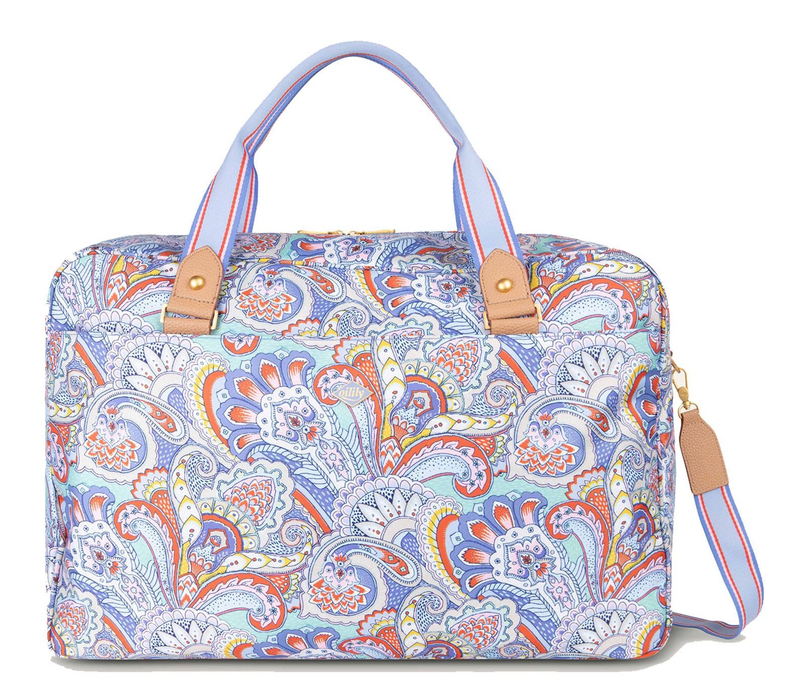 Geräumiger Weekender aus robustem Material mit farbenfrohen Paisley Blumenprint für kurze und lange Reise. Er bietet genug Stauraum für Kleidung, Schuhe, Kosmetiktasche und die Lieblingsstücke, die jede Frau bei sich haben muss. Die strapazierfähigen Materialien halten nicht nur jedes Gewicht, sondern durch das Wasser abweisende Obermaterial auch jede Wetterlage aus. Die polierte Hardware in Gold und Nylon-Reißverschlüsse in Metalloptik runden den perfekten Look ab.