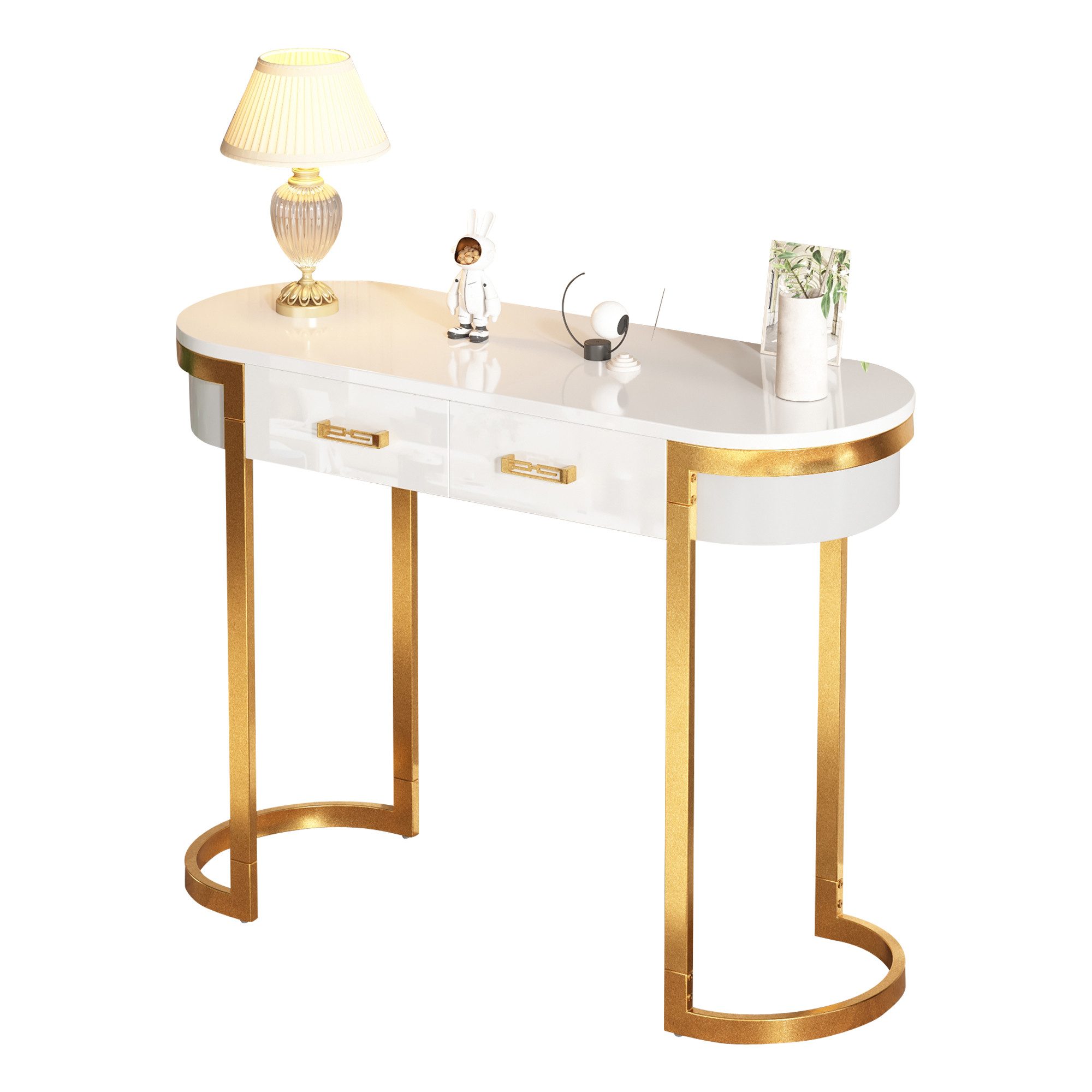 Dieser weiße Beistelltisch ist ein wahres Meisterwerk in Ihrem Zuhause. Mit einer hochglänzenden Oberfläche und einem edlen goldenen Sockel ist dieser Tisch nicht nur ein funktionales Möbelstück, sondern auch ein echtes Design-Highlight. Die großzügigen Maße von 100 × 40 × 76 cm machen ihn perfekt für jedes moderne Wohnzimmer, Schlafzimmer oder den Flur.