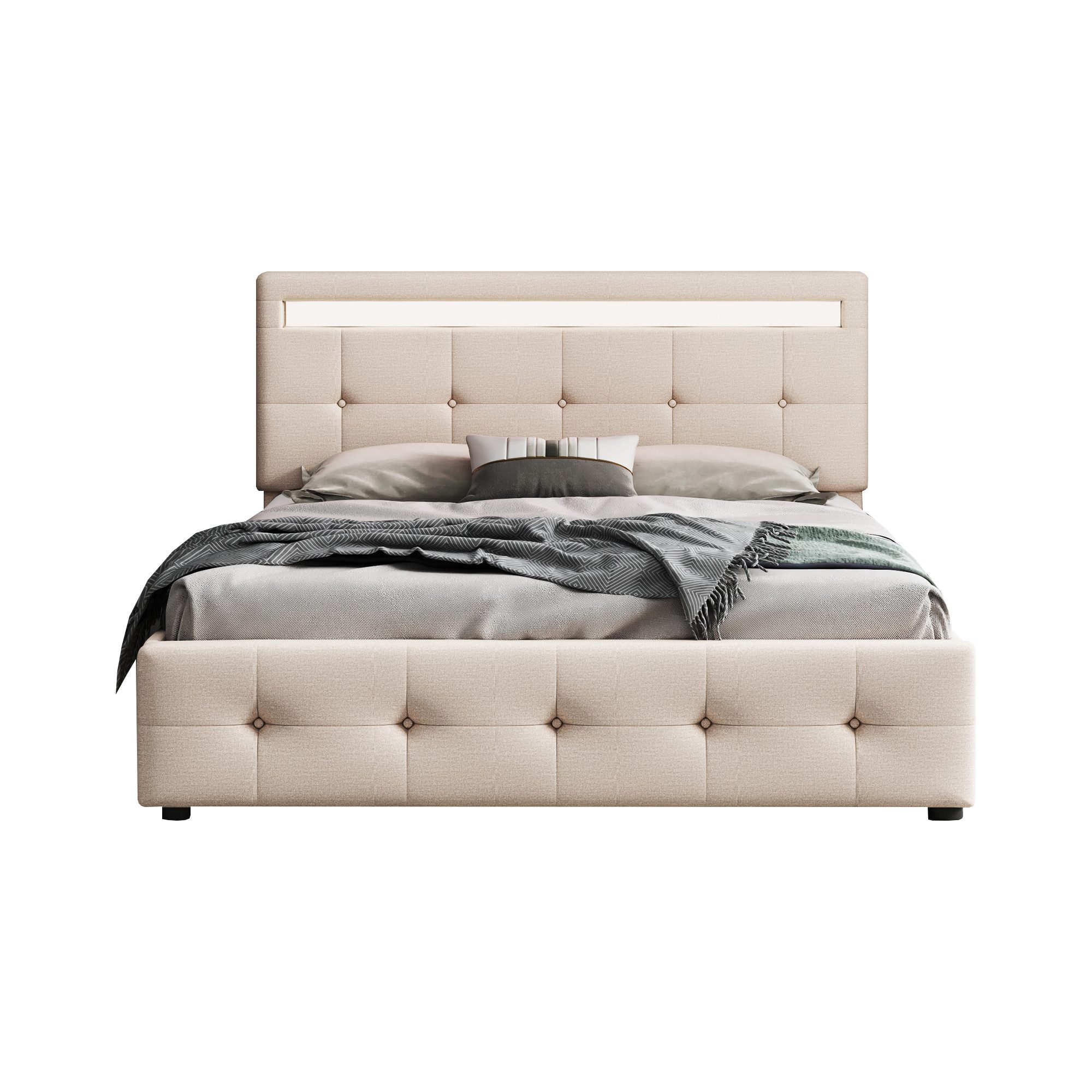 Der Bettrahmen ist mit hochwertigem Leinenstoff bezogen und verfügt über 4 ausziehbare Schubladen, jede mit 4 Rollen für leichtes Herausziehen. Diese Schubladen bieten reichlich versteckten Stauraum, ideal für die Aufbewahrung von Kleidung, Bettwäsche