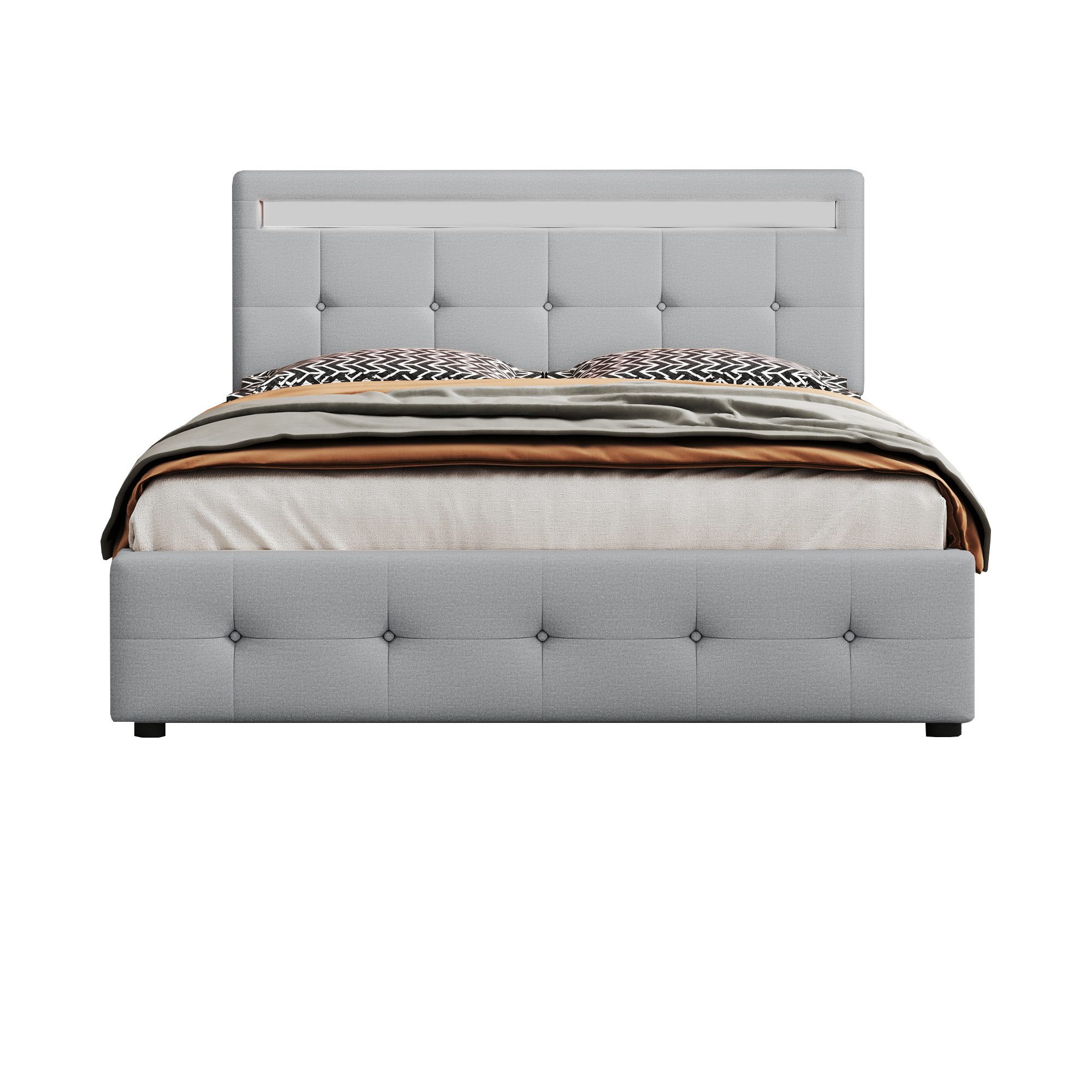 Dieses stilvolle Bett ist mit wunderschönen LED-Leuchten rund um das Kopfteil ausgestattet. Die Beleuchtung kann bequem über eine 24-Tasten-Fernbedienung gesteuert werden, die 4 automatische Wechselmodi und 16 verschiedene Lichtwechselfarben bietet. Diese