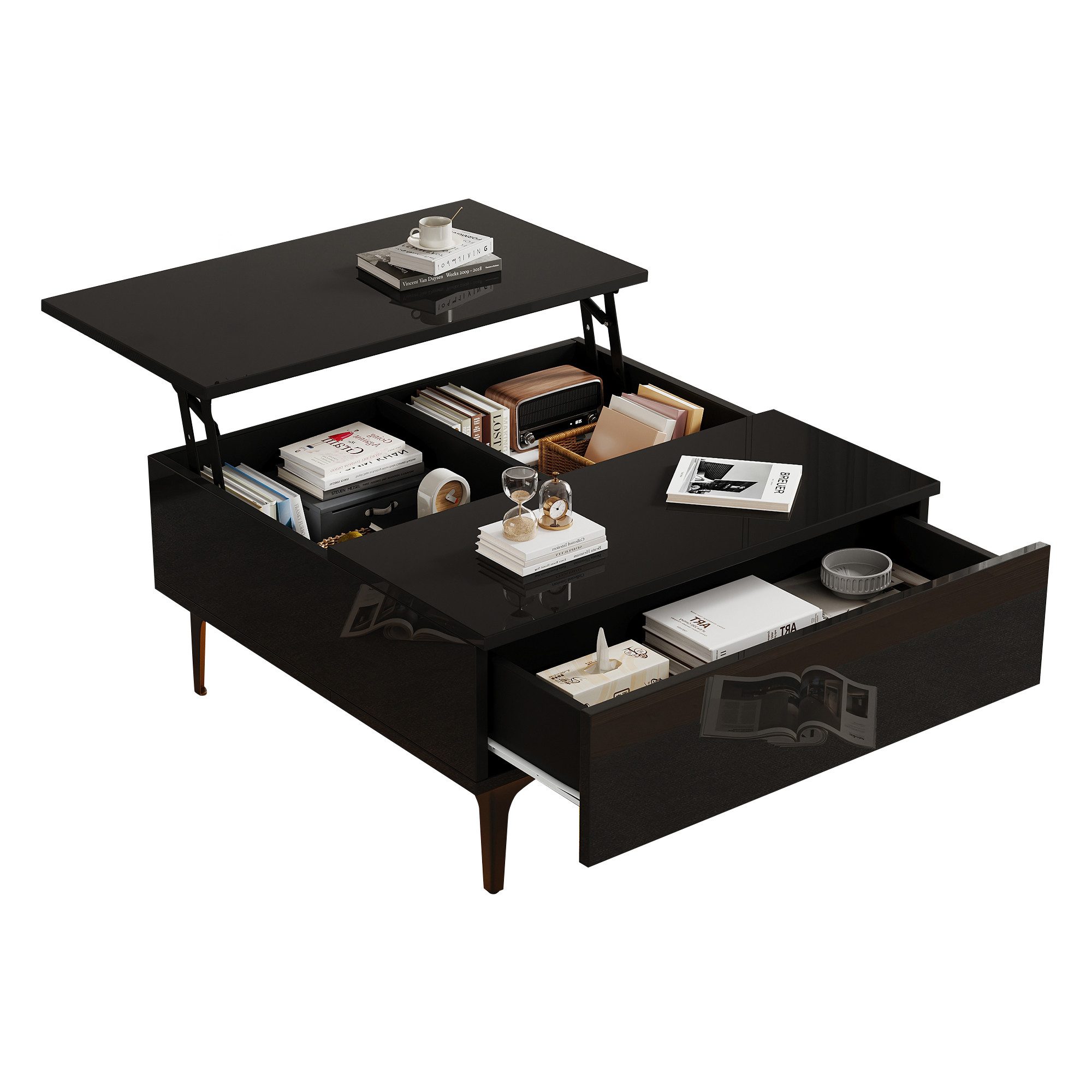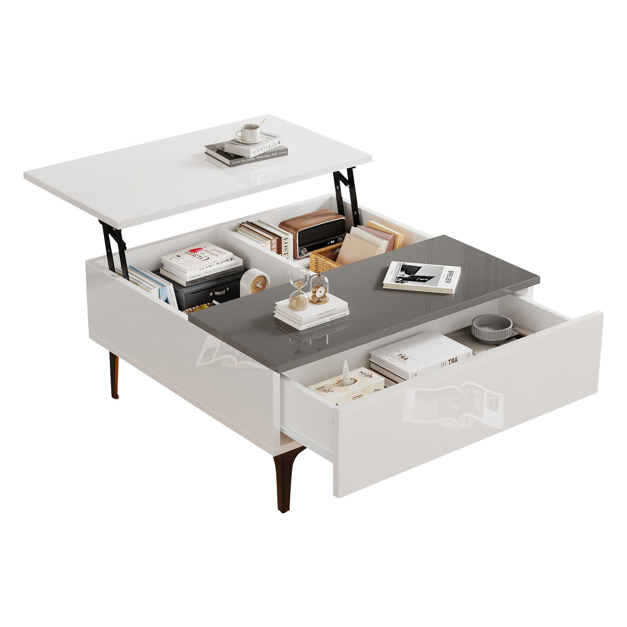 Dieser moderne Tisch beeindruckt mit seiner geometrischen Form und dem hochwertigen MDF-Material. Er ist die perfekte Lösung für kleine Wohnungen, da er sowohl funktional als auch ästhetisch ist. Die Tischplatte lässt sich hydraulisch verstellen, um zwischen Arbeiten und Entspannen problemlos zu wechseln. Mit einer maximalen Höhe von 48,5 cm können Sie den Tisch schnell an Ihre Bedürfnisse anpassen. Der Tisch bietet zudem durch seine doppelschichtigen Ablagefächer und die unsichtbare Push-Pull-Schublade reichlich Stauraum für Fernbedienungen, Kabel oder Schreibwaren, wodurch er Ihre Wohnung ordentlich und aufgeräumt hält.