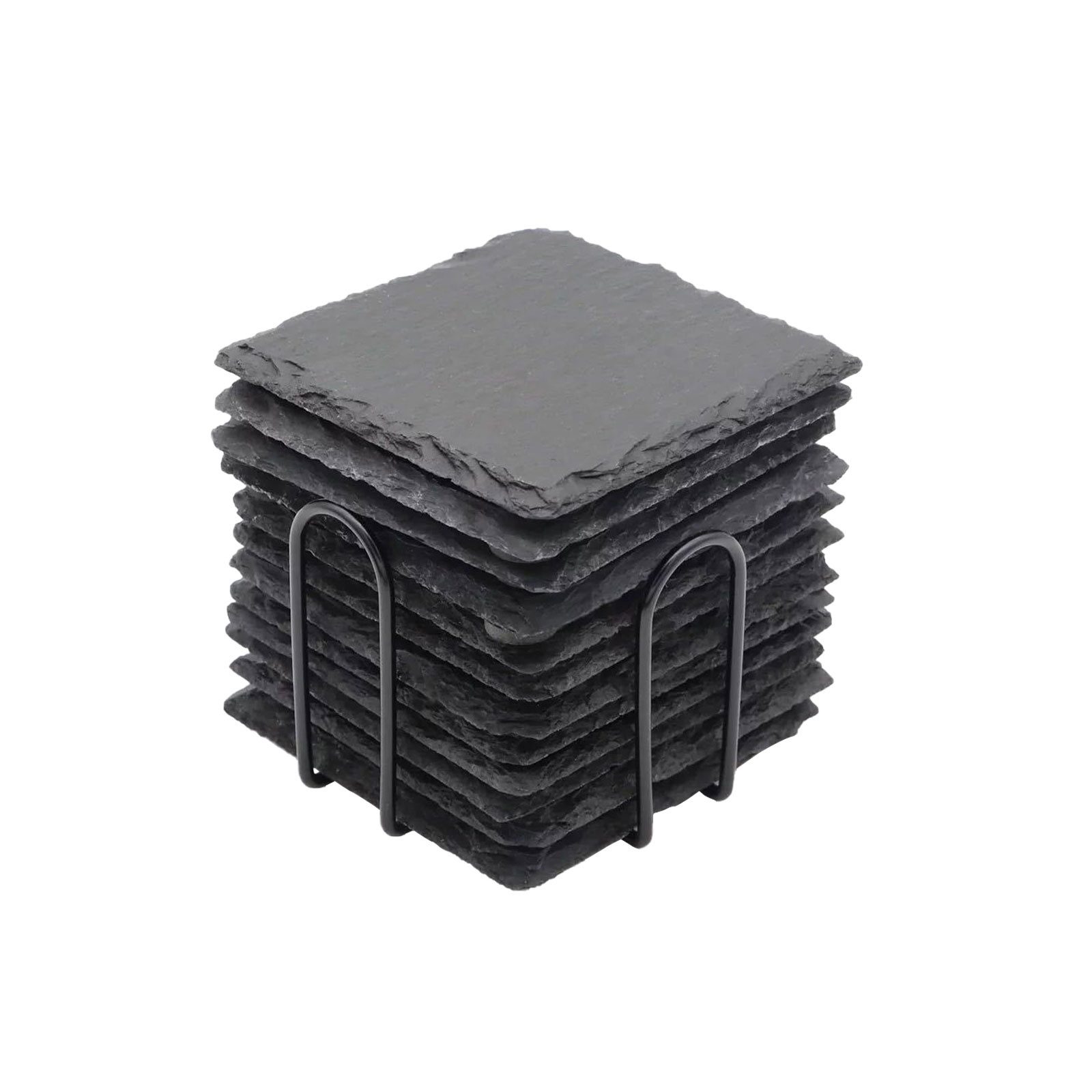 SCHIEFER UNTERSETZER SET - Im Lieferumfang sind 12 quadratische Schieferuntersetzer mit einem Durchmesser von 4 Zoll und 1 Untersetzerhalter enthalten. Mit der schönen Metallhalterung müssen Sie sich keine Gedanken über die Lagerung der Untersetzer machen.