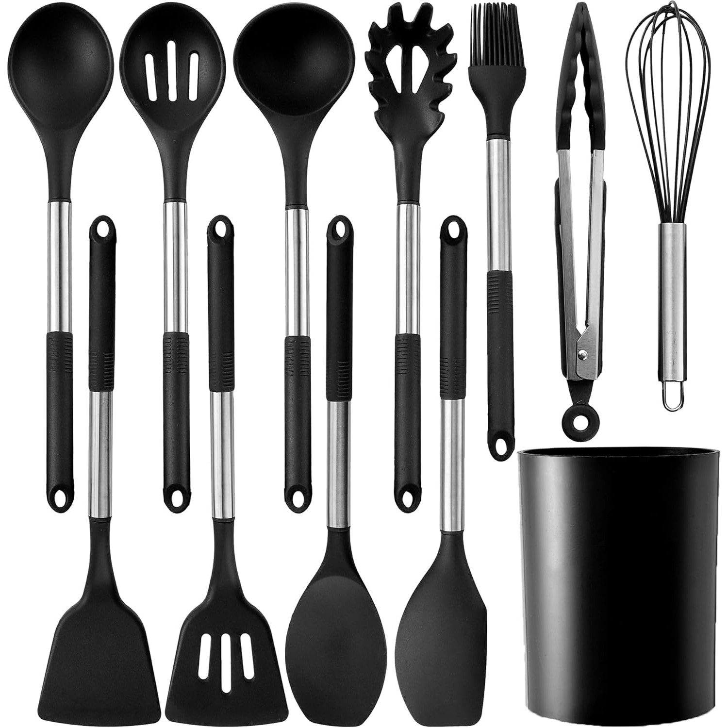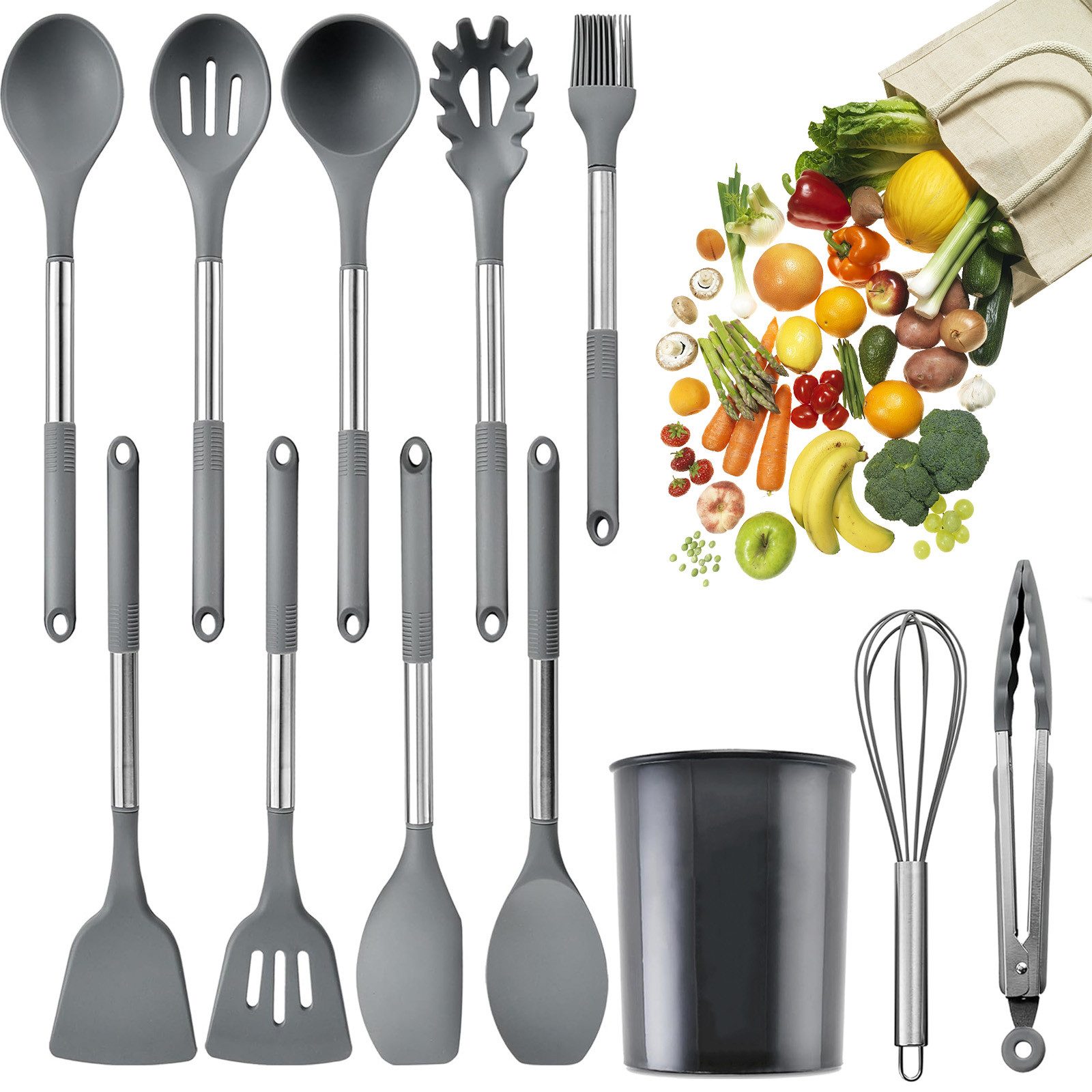 Enthält: Pfannenwender, Sieb, Schöpfkelle, Abtropflöffel, Teigschaber, Spatel, Suppenkelle, Spaghettilöffel, Backpinsel, Schneebesen, Küchenzange und Utensilienhalter.