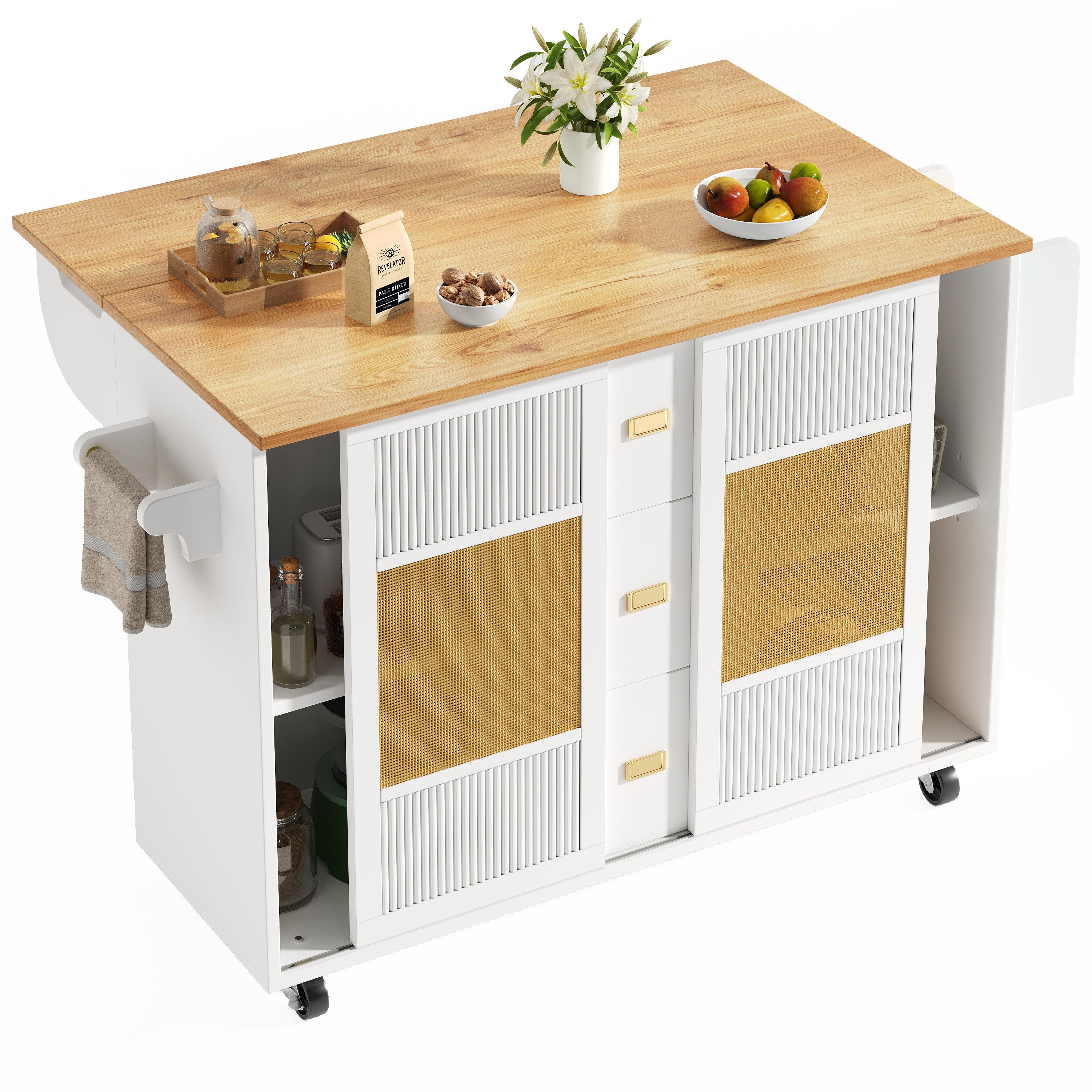 Die Kücheninsel besticht durch dreistufige Schubladen, doppelseitige Schiebetüren und verstellbare Regale, die vielseitigen Stauraum bieten. Все Ihre Küchengeräte, Gewürze und Töpfe finden in dieser Kücheninsel ihren Platz. Besonders praktisch ist die großzügige Rattan-Design-Tür an der Front, die nicht nur für Ordnung sorgt, sondern auch einen stilvollen Look in Ihrer Küche hinterlässt.