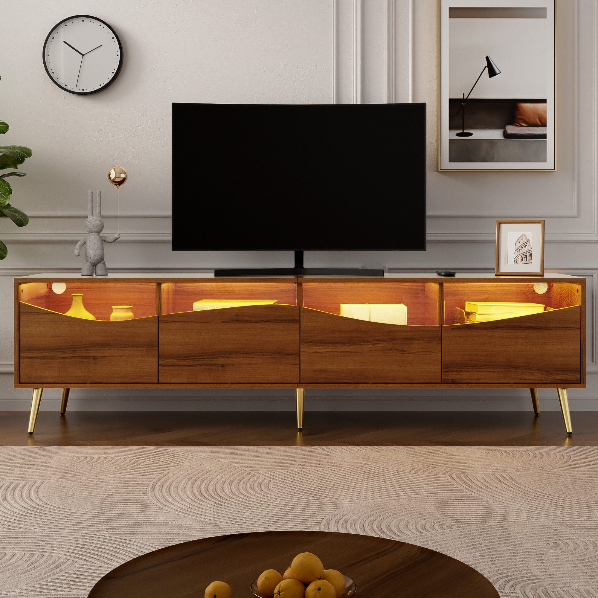 Entdecken Sie den modernen TV-Schrank, der stilvolles Design mit praktischer Funktionalität vereint. Mit seinen großzügigen Maßen von 180 x 40 x 50 cm bietet er ausreichend Platz für Ihren Fernseher und Dekoration. Der Walnussfarbee Korpus aus hochwertigem MDF sorgt für eine elegante Oberfläche und verleiht Ihrem Wohnzimmer einen zeitlosen Look.