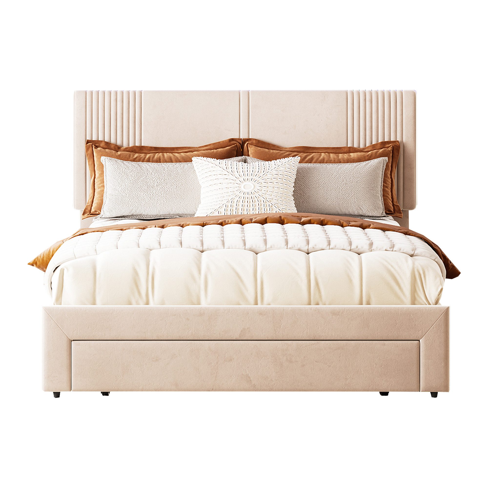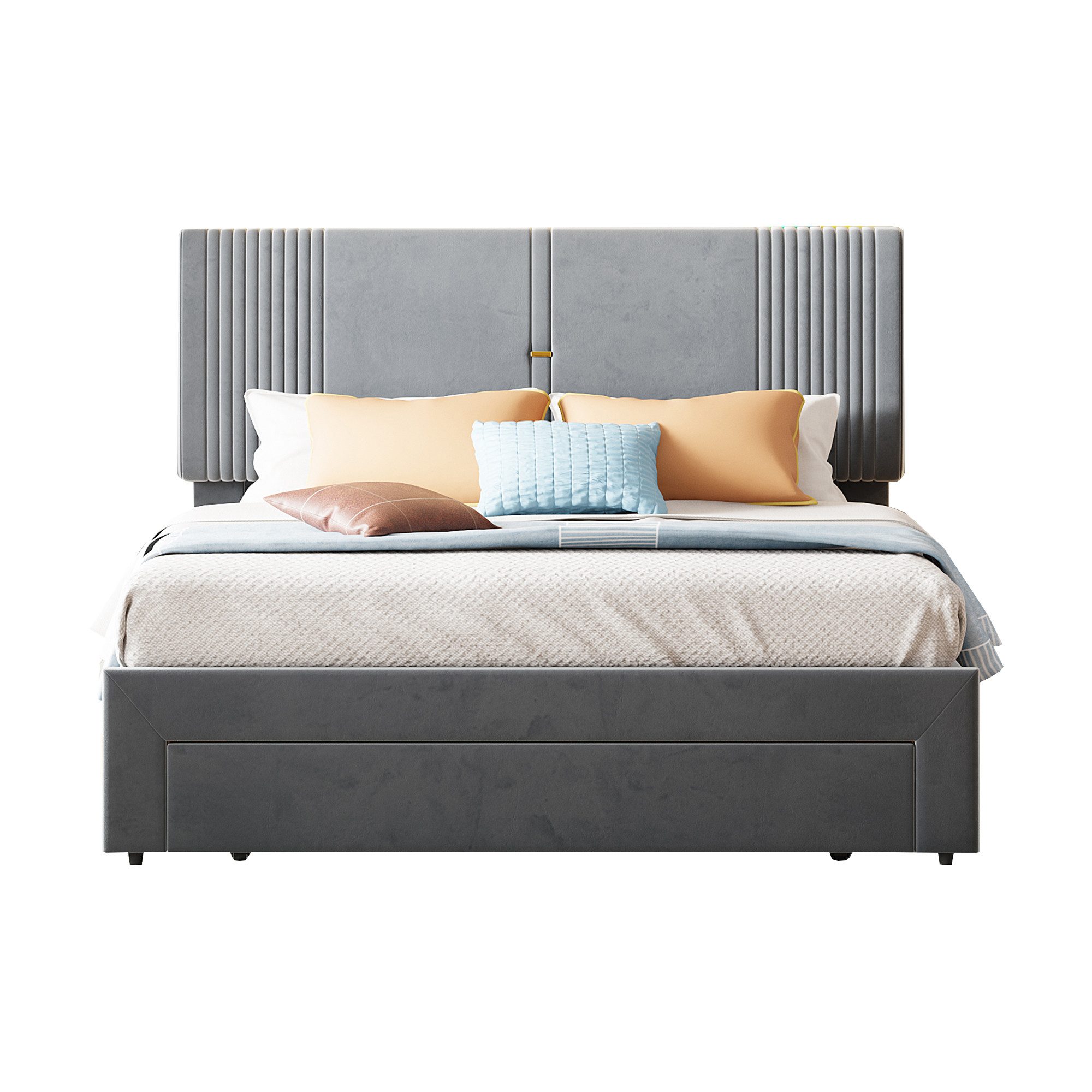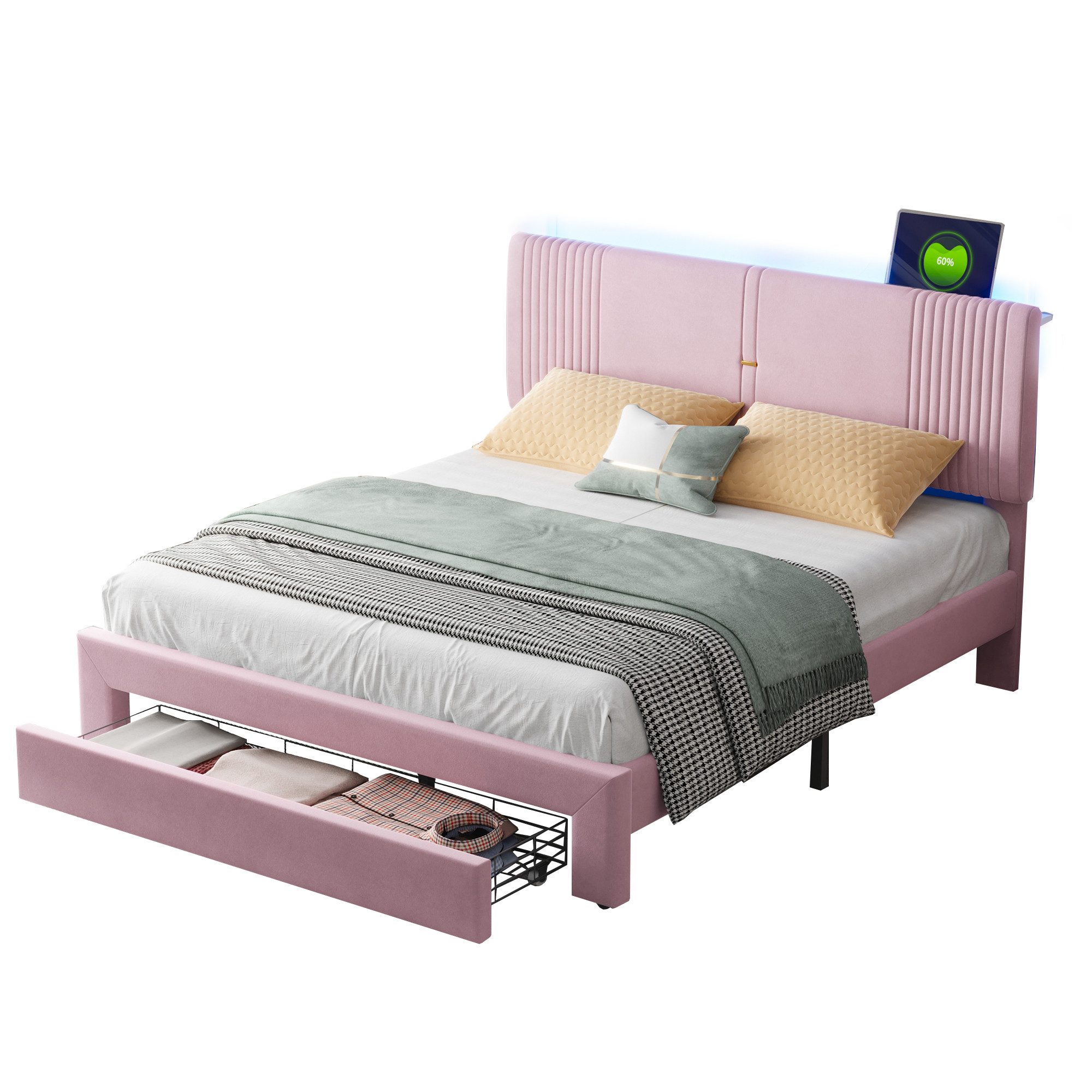 Ausstattung | mit Lichtleiste und USB-Buchse, Rückenlehne und großer Schublade, hautfreundliches Doppelbett in Samtstoff |