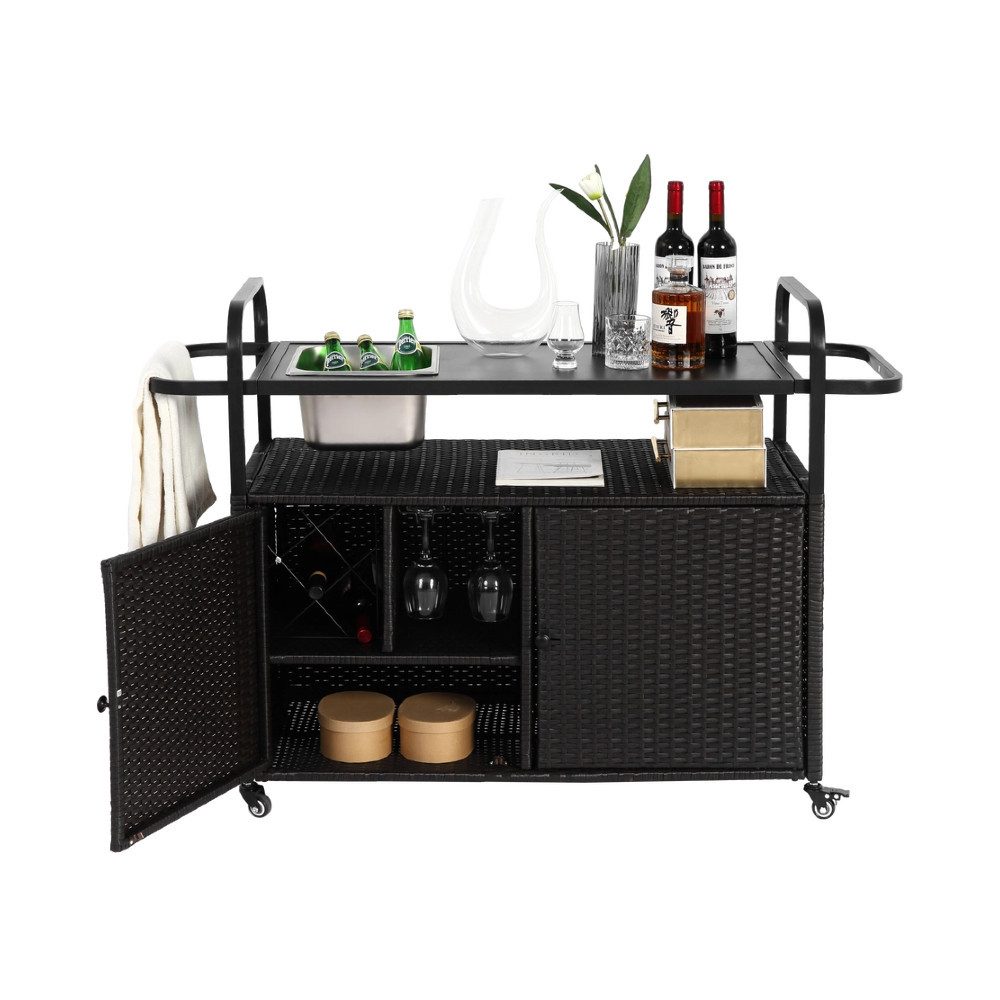 Verleihen Sie Ihrer Außenküche oder Terrasse mit unserem Outdoor Bar Tisch einen Hauch von Funktionalität und Stil. Der pulverbeschichtete Stahlrahmen bietet hervorragende Wetterbeständigkeit, während der PE-Rattan-Schrank für Langlebigkeit und Atmungsaktivität sorgt. Die 360-Grad-Räder ermöglichen mühelose Bewegung, und mit feststellbaren Rädern können Sie den Tisch sicher positionieren. Der praktische Seitengriff und der Seitenkorb bieten zusätzlichen Stauraum für Flaschen oder Kochutensilien. Dieser Tisch ist ideal für den Einsatz in Ihrem Garten, auf der Terrasse oder in der Küche.