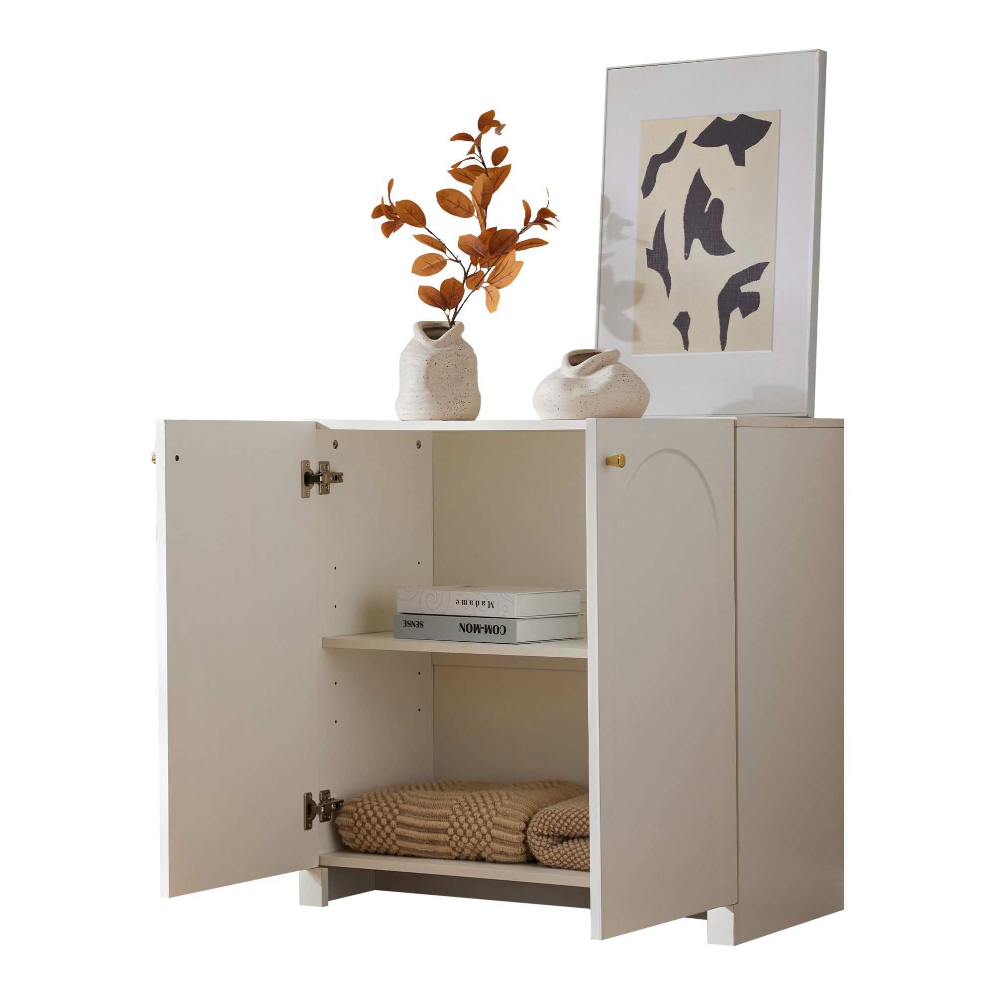 Das Sideboard von OKWISH kombiniert luxuriöse Details und praktisches Design. Die goldenen Griffe und das dezente Bogenmuster verleihen jedem Raum eine besondere Eleganz. Die stabile Struktur aus hochwertigen Holzplatten sorgt für Langlebigkeit und Sicherheit. Im Inneren bietet das Sideboard ausreichend Stauraum für Ihre persönlichen Gegenstände, während die pflegeleichte Oberfläche eine mühelose Reinigung ermöglicht.