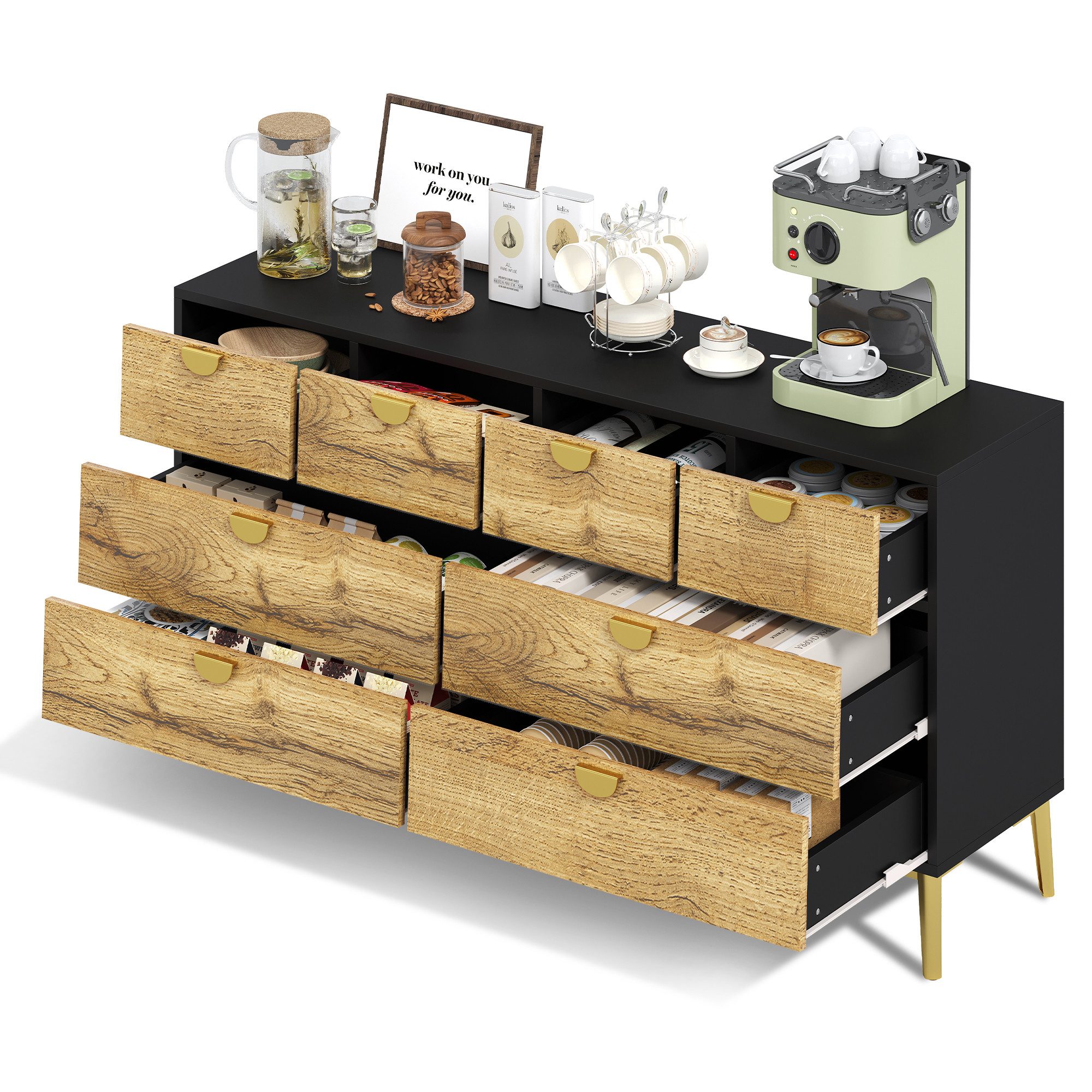 Verleihen Sie Ihrem Esszimmer oder Wohnzimmer mit diesem eleganten Sideboard aus schwarzem MDF und naturfarbenem Holz eine stilvolle und praktische Note. Mit 8 großzügigen Schubladen und luxuriösen Details ist es die perfekte Lösung für eine moderne Aufbewahrungslösung, die in jedes Zuhause passt.