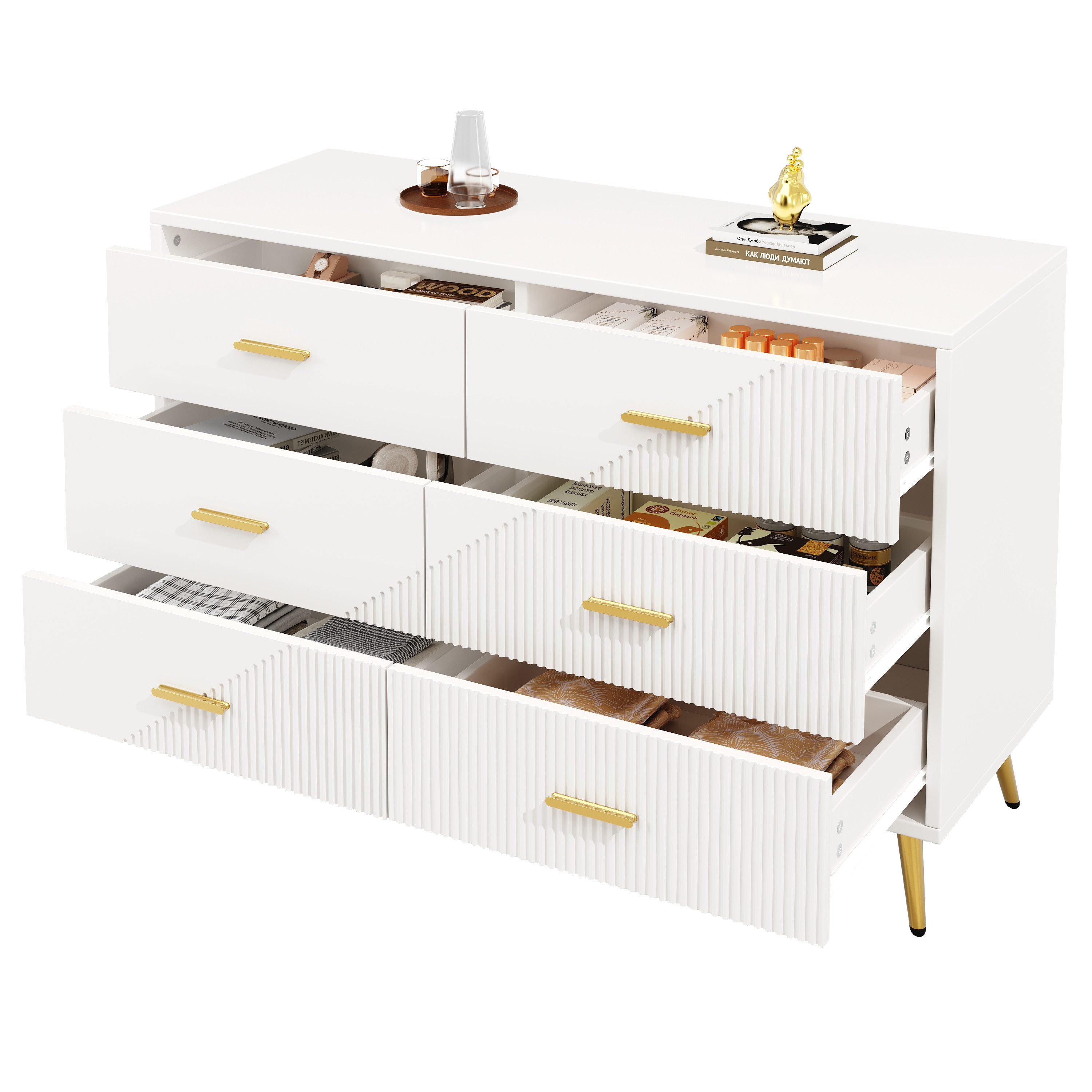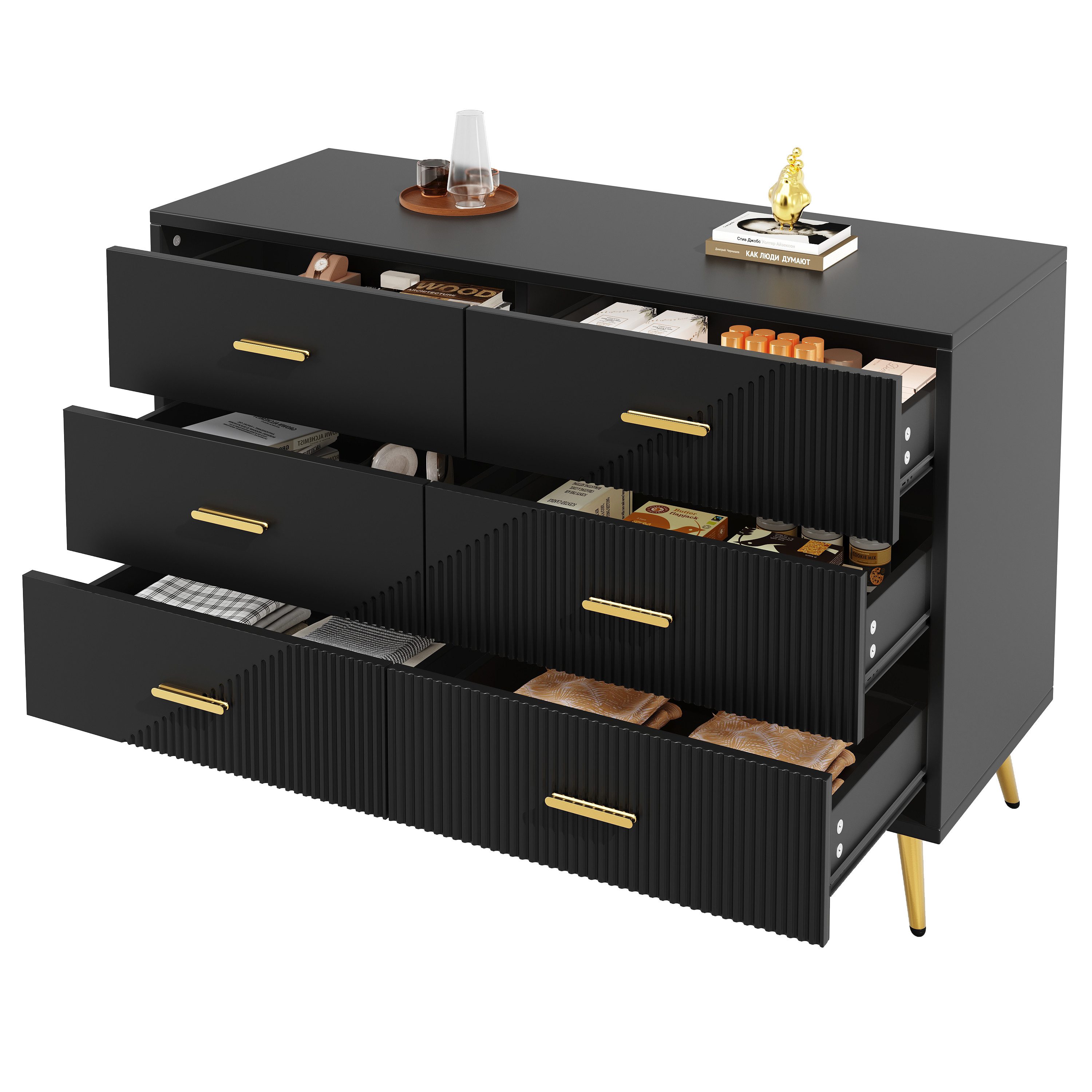 Mit insgesamt 6 Schubladen bietet dieses Sideboard großzügigen Stauraum für eine Vielzahl von Gegenständen. Sie können Dekorationen, Geschirr, Bücher oder sogar persönliche Gegenstände sicher verstauen. Die Schubladen sind mit einer Puffervorrichtung ausgestattet, um Geräusche zu minimieren und für zusätzliche Sicherheit zu sorgen.