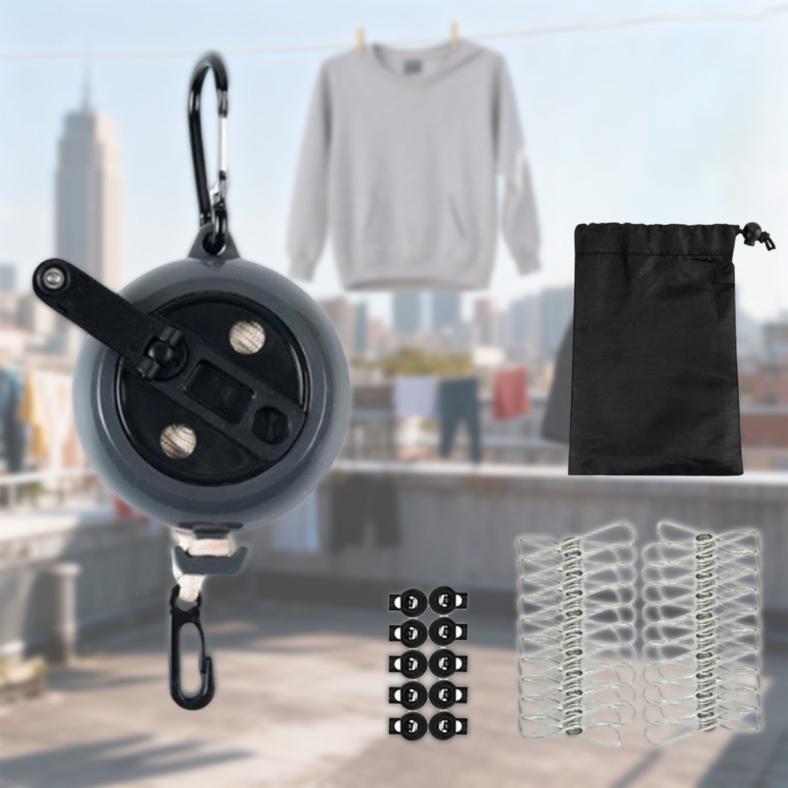20 rostfreie Edelstahlklammern sorgen für sicheren Halt der Kleidung, während die Aufbewahrungstasche Transport und Organisation erleichtert.