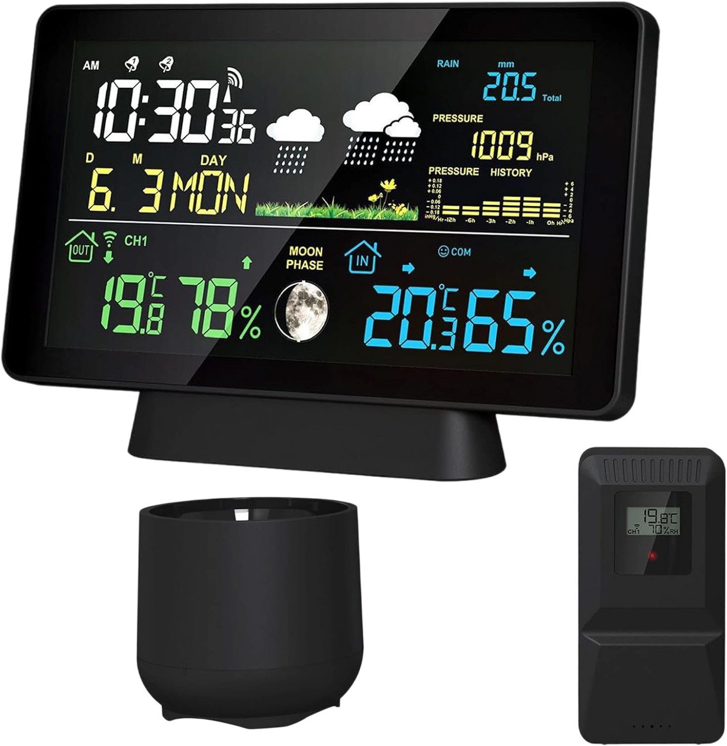Diese multifunktionale Wetterstation zeigt Innen- und Außentemperatur, Luftfeuchtigkeit, Luftdruck, Mondphasen und Wettertrends an. Sie bietet zudem Kalenderfunktionen, einen doppelten Wecker mit Schlaffunktion und Außendaten, ideal für Wohnzimmer, Schlafzimmer oder Gewächshaus.