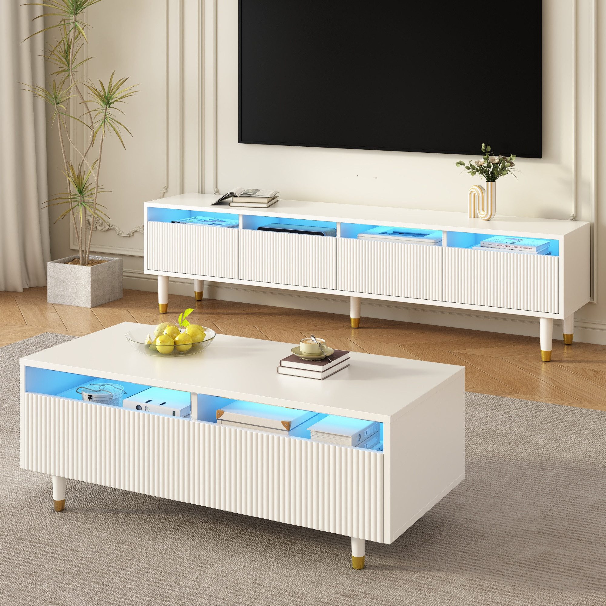 Dieses stilvolle Wohnzimmer-Set umfasst einen TV-Ständer und einen Couchtisch, die sich perfekt in moderne und luxuriöse Wohnräume integrieren lassen. Mit der 7-farbigen LED-Beleuchtung, die per Fernbedienung gesteuert werden kann, setzen Sie stimmungsvolle Akzente. Der TV-Ständer mit vier Türen und der Couchtisch mit zwei Schubladen bieten großzügigen Stauraum für Ihre Geräte, Bücher und Dekoration.