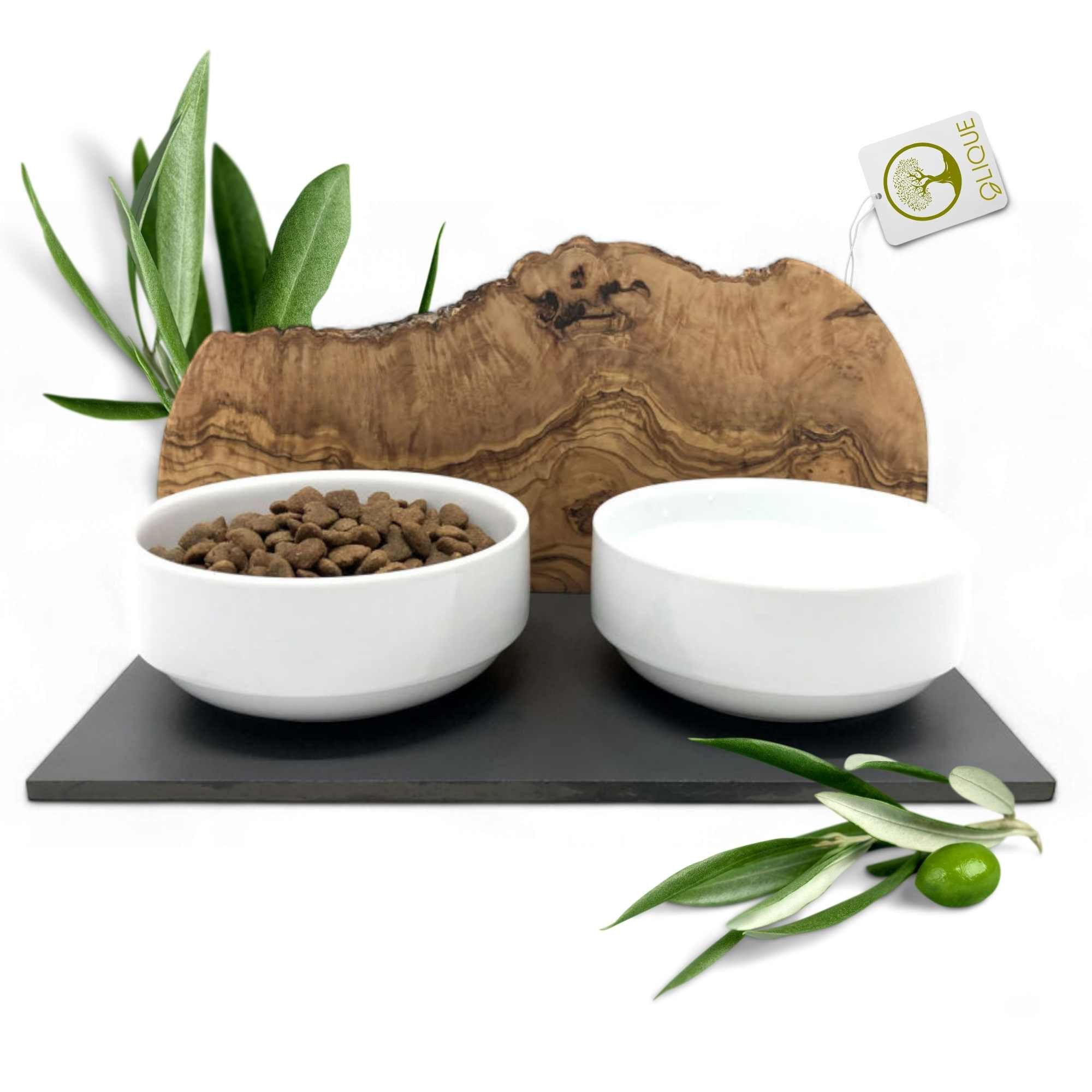 Das Highlight dieser Futterstation ist die schwarze Platte aus extrem unempfindlichem Material, auf der die Schalen platziert sind. Als Spritzschutz dient ein rustikal massives Brett aus Olivenholz, das nicht nur funktional ist, sondern auch optisch einen Hauch von Natur in Ihr Zuhause bringt. Durch den natürlich rustikalen Rand ähnelt die Futterstation einem imposanten Berg und wird zum Blickfang in jedem Raum.