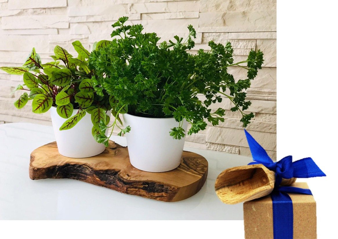 1x Kräuterstation, Brett Olivenholz mit 2 weißen Übertöpfen, plus Überraschung