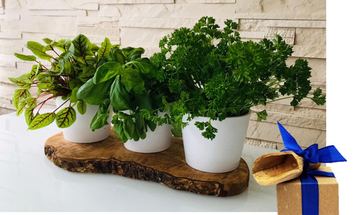1x Kräuterstation, Brett Olivenholz mit 3 weißen Übertöpfen, plus Überraschung