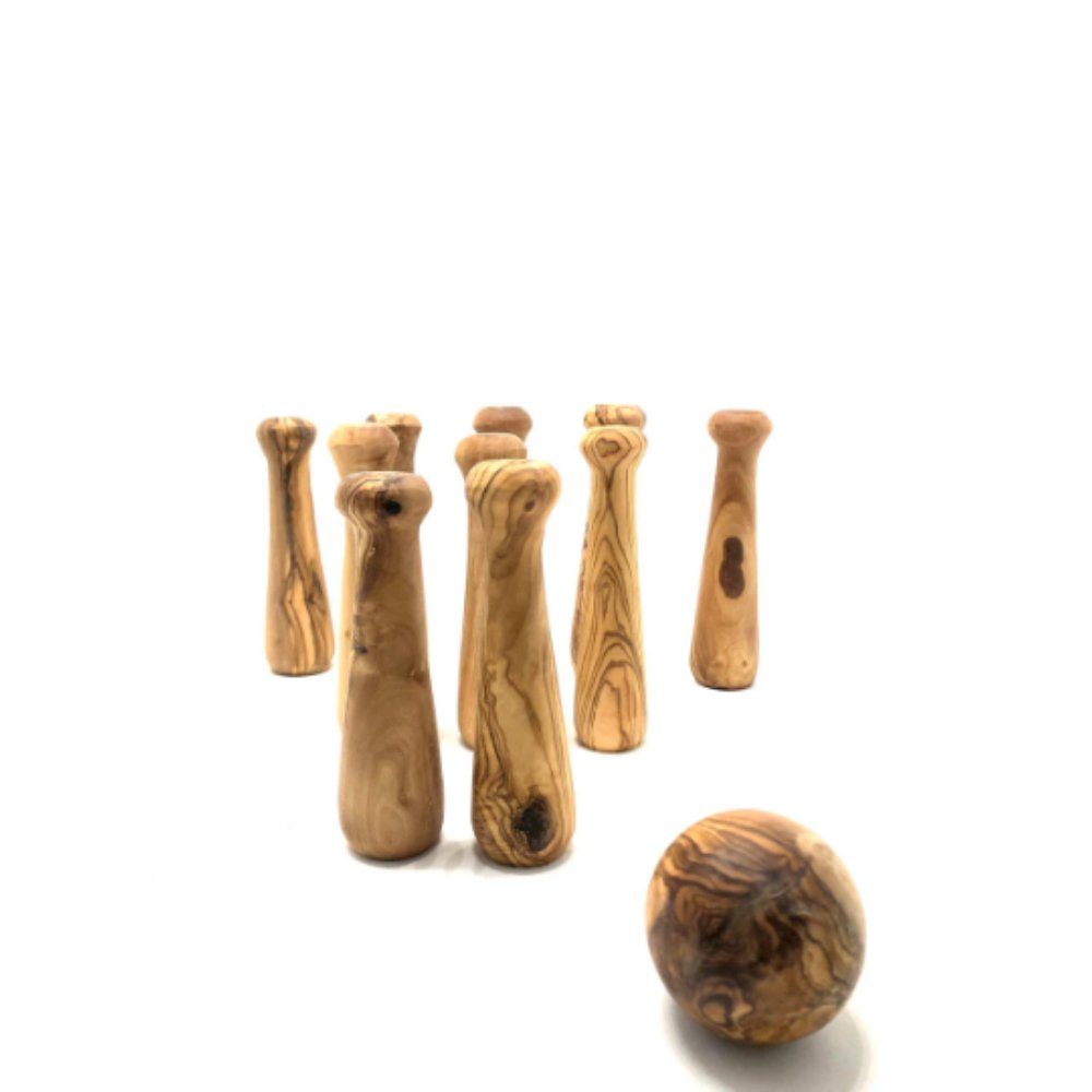 Lieferumfang | 10 Pins (Kegel ) und eine Kugel aus massivem Olivenholz. |