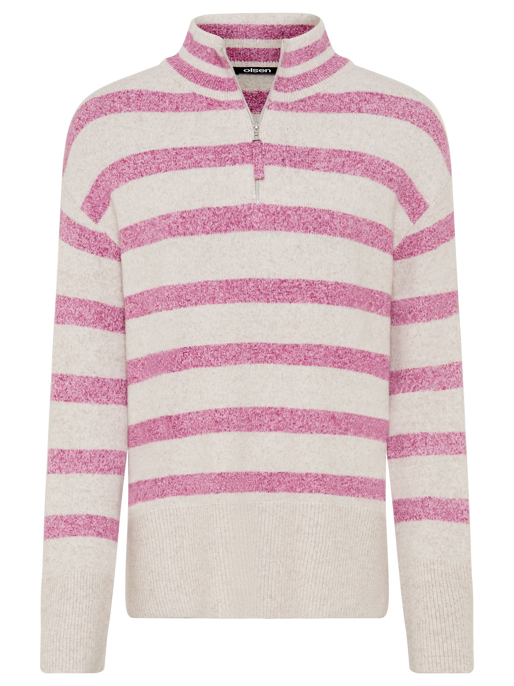 Der Troyer-Pullover von Olsen präsentiert sich als modischer Klassiker mit sportiver Note. In der weiten Olsen-Passform „Cora“ geschnitten, bietet er angenehme Bewegungsfreiheit und eine lässig-feminine Silhouette. Der kurze Reißverschluss am Troyerkragen verleiht dem Pullover einen sportlich-eleganten Charakter, während die markanten Blockstreifen für einen modernen Blickfang sorgen.