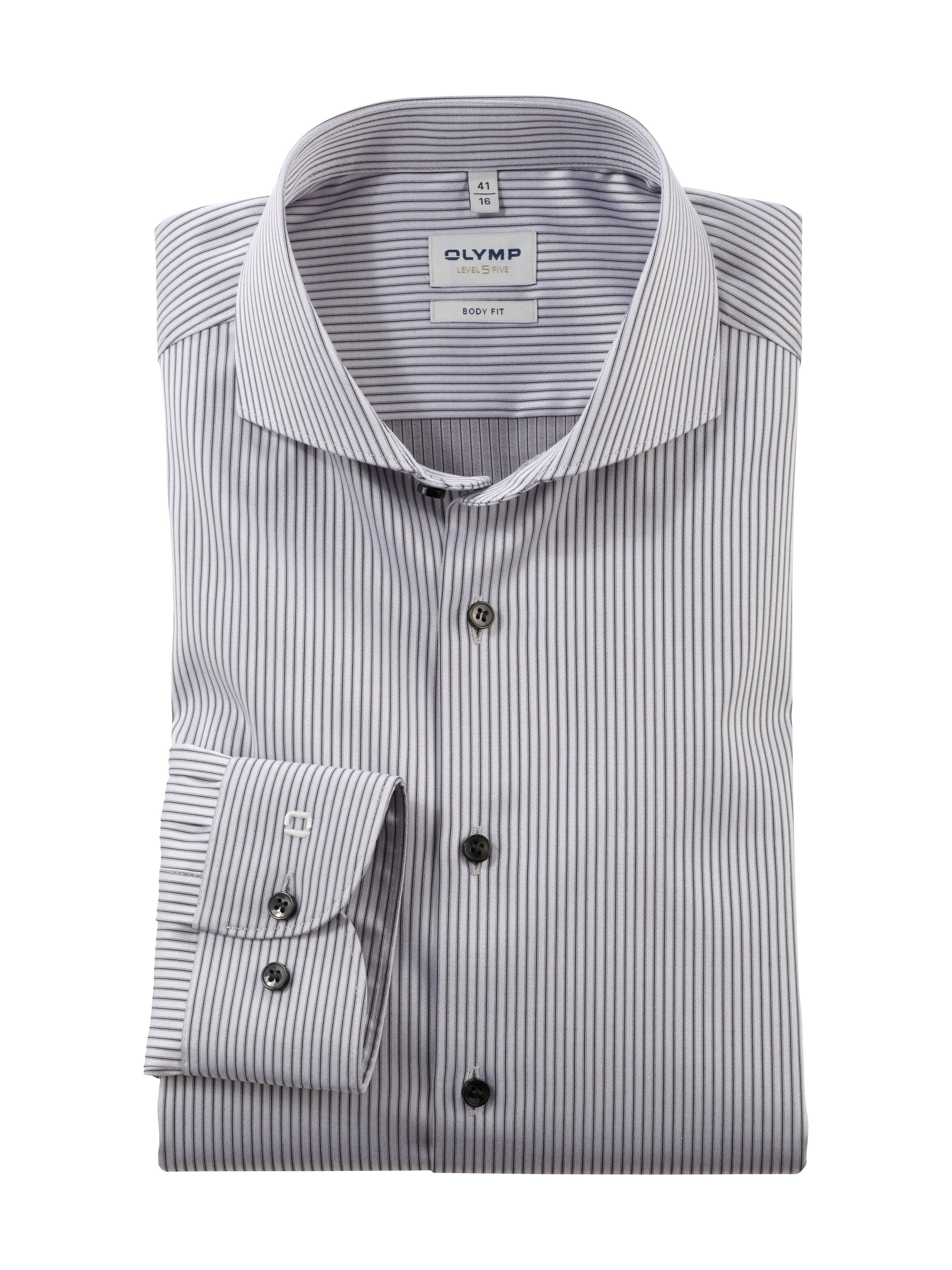 Dieses elegante OLYMP Level Five Hemd ist perfekt für den sportlich schlanken Mann. Das superfeine Comfort-Stretch-Gewebe überzeugt mit klassischen Webstreifen und einer matt schimmernden Textur in edlem Silbergrau.