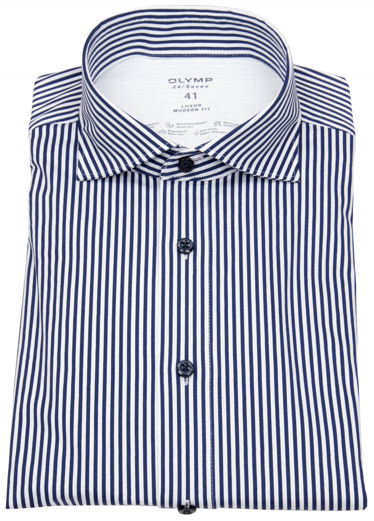 Mit dem Businesshemd »Luxor 24/Seven modern fit« von OLYMP stellst du im Handumdrehen ein neues Outfit zusammen. Der Kentkragen ist mit seinen mittellangen, spitzen Kragenenden ein echter Klassiker, der sich für breite Krawattenknoten eignet. Dieses Hemd ist komfortabel geschnitten, sodass du einen hohen Tragekomfort hast.