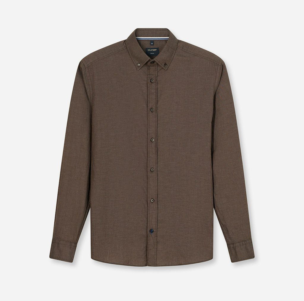 Mit dem Langarmhemd von OLYMP stellst du im Handumdrehen ein neues Outfit zusammen. Der Button-down-Kragen kommt ohne Kragenstäbchen und gestärkte Krageneinlage aus, denn kleine Knöpfe fixieren die Kragenspitzen und sorgen für guten Halt bei jeder Bewegung. Die langen Ärmel enden in einer Manschette. Dieses Hemd ist normal sowie basic geschnitten, sodass dein Oberkörper dezent in Szene gesetzt wird.