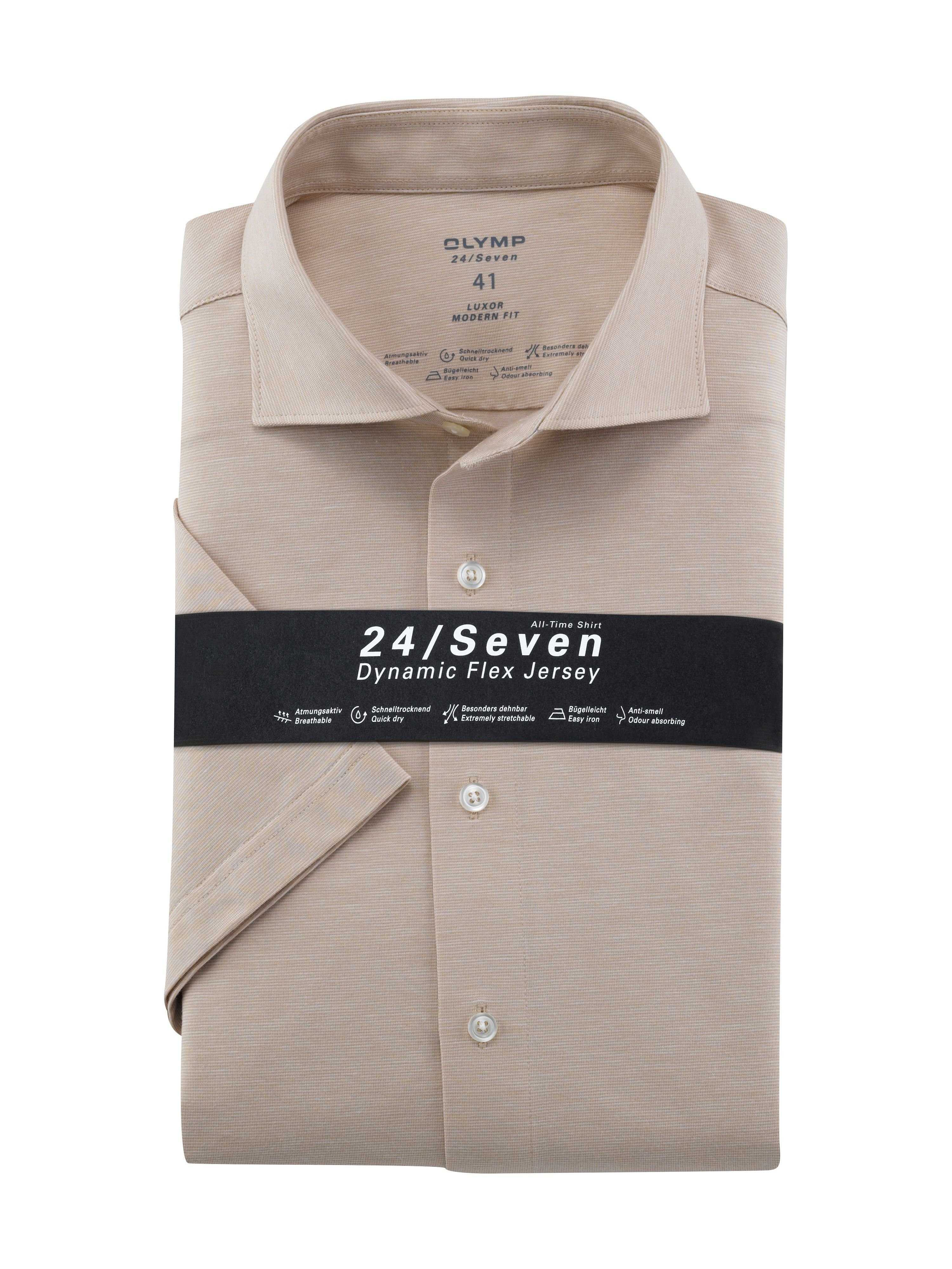 Weicher, sehr elastischer und atmungsaktiver Jersey, der Körpergeruch absorbiert, schnell trocknet und sich leicht bügeln lässt – das ist die zeitgemäße, entspannte und seriöse Form, ins Business zu starten. Die OLYMP Luxor modern fit Kurzarm-Hemden aus Dynamic-Flex-Jersey sind bequem wie ein T-Shirt und gleichzeitig so stilvoll wie ein Hemd, das die sportlich körperbetonte Form den ganzen Arbeitstag und darüber hinaus ganz ohne Knitter hält. 24/Seven eben. In feiner Strickstruktur und klassischem Kent sorgt es für die lässige Performance der jungen Start-up-Generation genauso wie für den routiniert erfolgreichen Auftritt sportlich trainierter Seniors im Business.