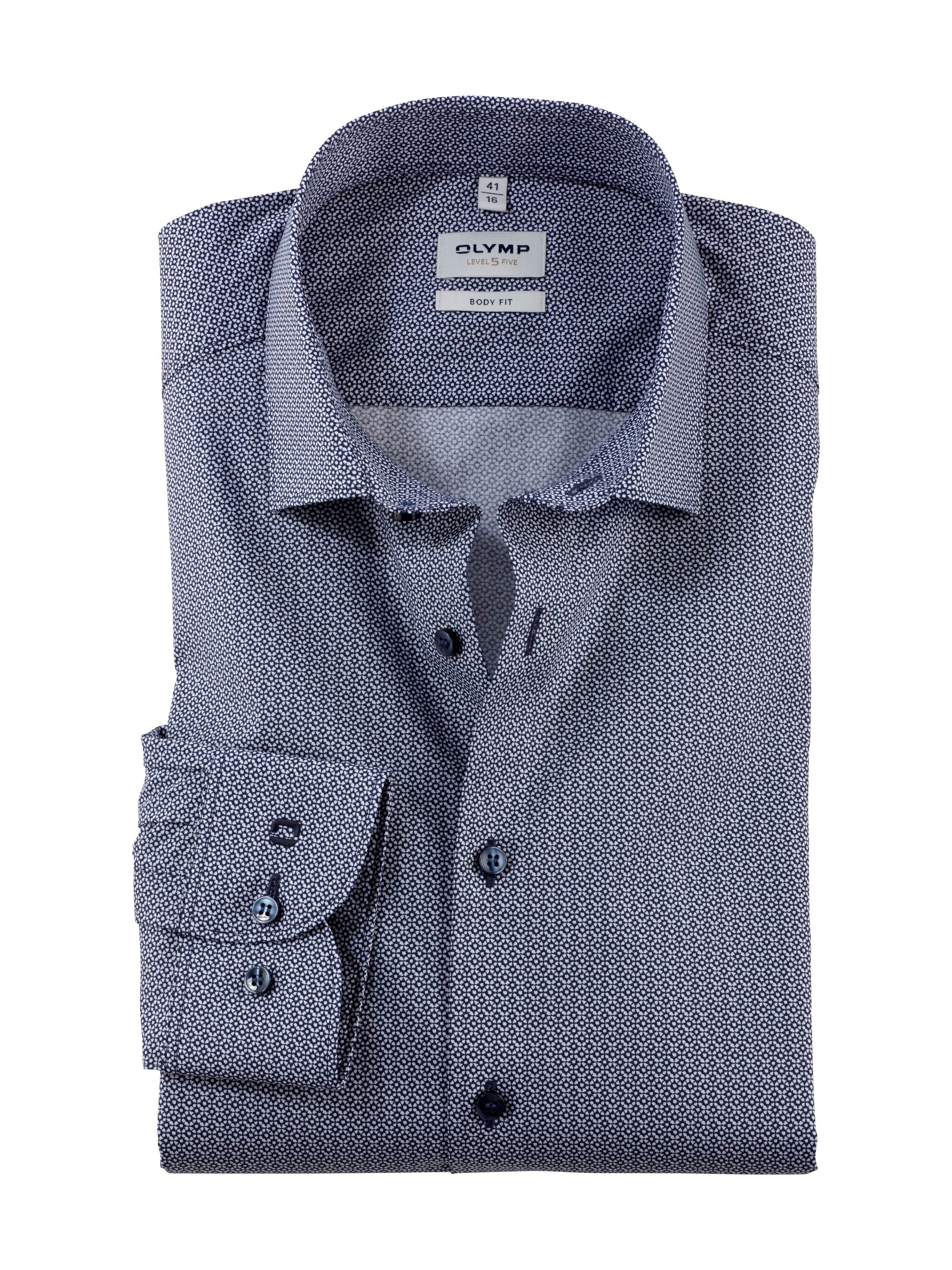 Stilsicherer Businesspartner für sportlich schlanke Männer. Der junge Look dieses OLYMP Level Five entsteht durch die körpernahe Linie, ergänzt durch einen smarten Modern Kent. Der elegante Rotationsdruck in Marine harmoniert ideal mit klassischen Business-Ensembles, lässt sich aber auch modisch inszenieren. Aus bügelleichtem Comfort Stretch.