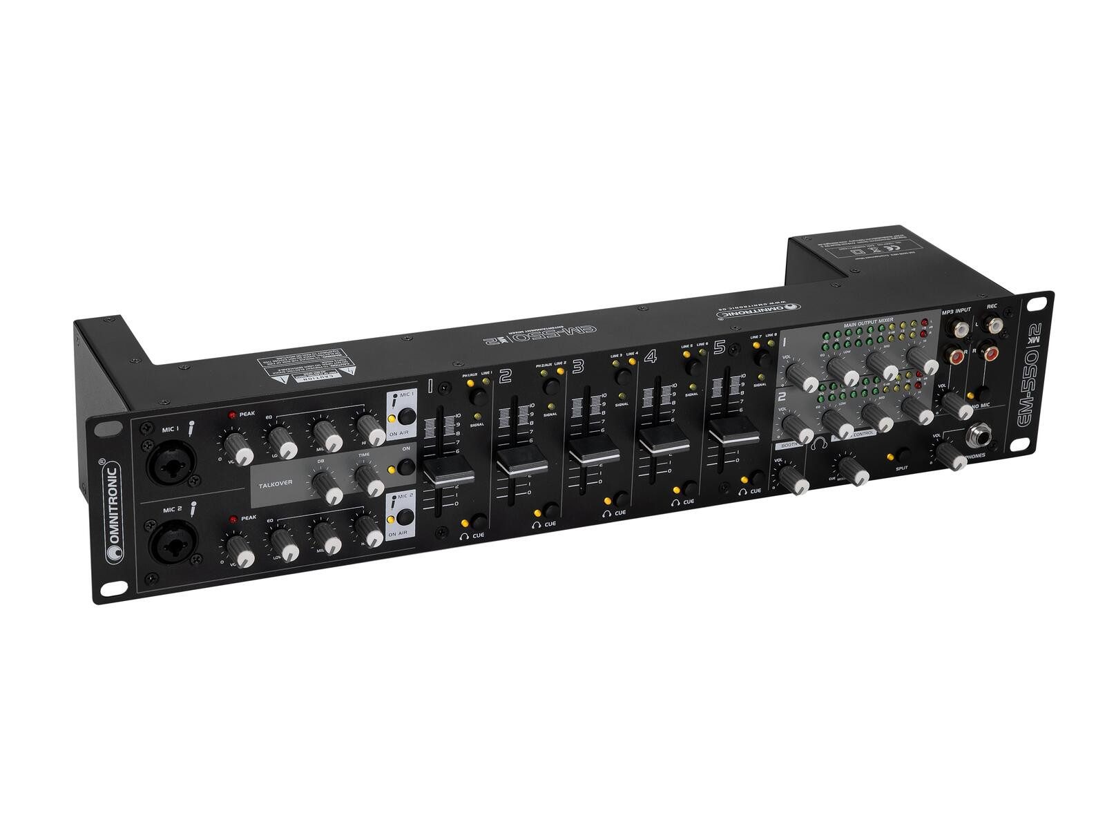 Kanäle: | Eingangskanal: 2 x Stereo mit Line-Line/Phono Schalter über Cinch, Kanalregelung über Fader, , Gainregler, Quellen-Umschalter, CUE-Schalter Eingangskanal: 3 x Stereo mit Line-Line Schalter über Cinch, Kanalregelung über Fader, , Gainregler, Quellen-Umschalter, CUE-Schalter Mikrofonkanal: 2 x Mono über Kombibuchse (XLR/KLINKE), Kanalregelung über Drehregler, Regler 3-Band EQ, ON AIR Schalter, Talkover Schalter Master-Ausgang: 2 x Stereo über XLR oder Cinch, Kanalregelung über Drehregler, Regler 3-Band EQ Rec. Ausgang: 2 x Stereo über Cinch, NO-MIC Schalter Kopfhörer-Ausgang: 1 x Stereo über Klinke, Kanalregelung über Drehregler, Cue-Mix-Split-Funktion Booth-Ausgang: 1 x Mono + Stereo über Cinch, Kanalregelung über Drehregler Eingangskanal: 1 x Stereo über Cinch, Kanalregelung über Drehregler |