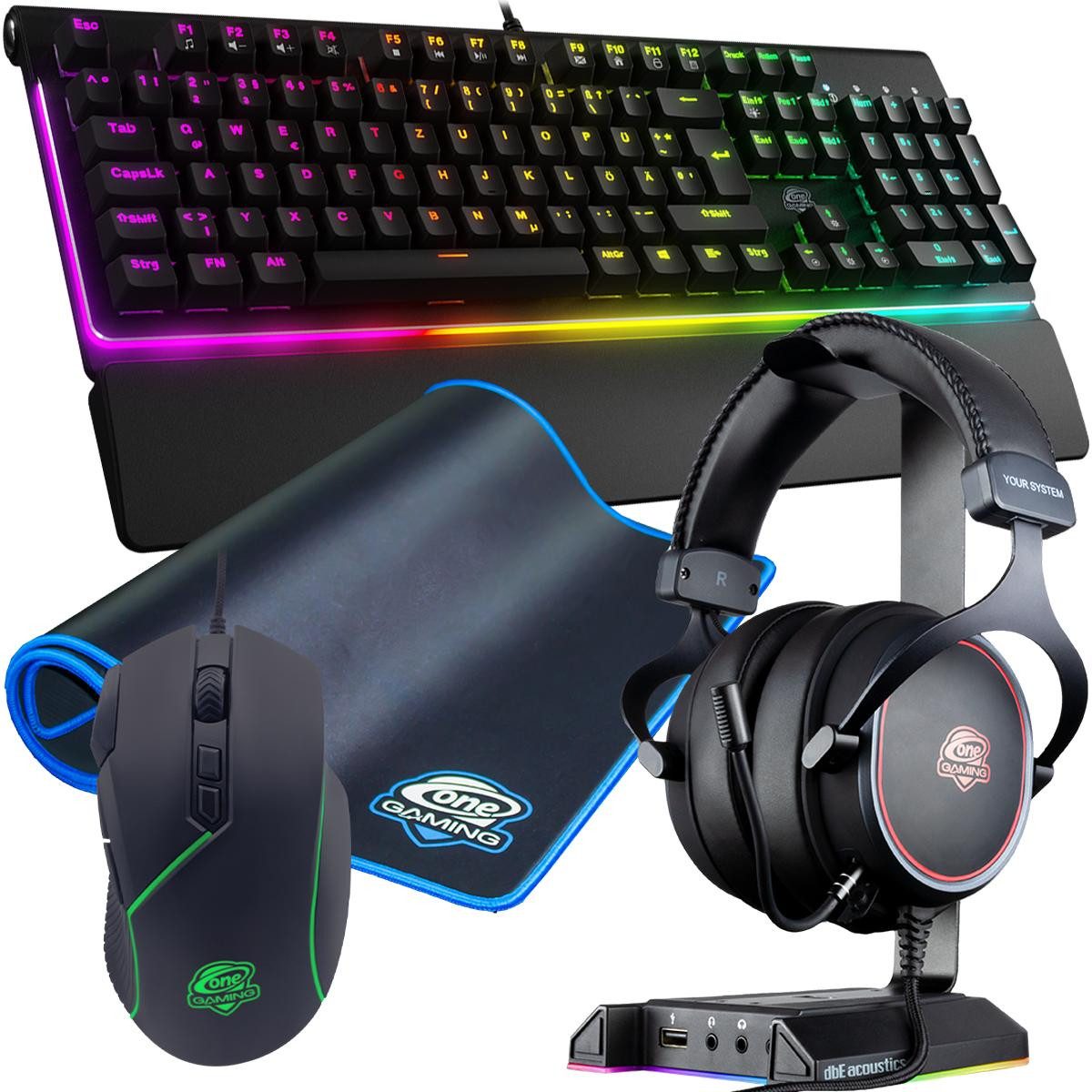 Zubehör-Bundle bestehend aus dem ONE GAMING GRID XL, der ONE GAMING Black Hawk Ultragrip 2.0, der ONE GAMING Shuriken Tastatur, dem ONE GAMING EQUALIZE Headset und dem ONE GAMING RGB Stand 7.1.