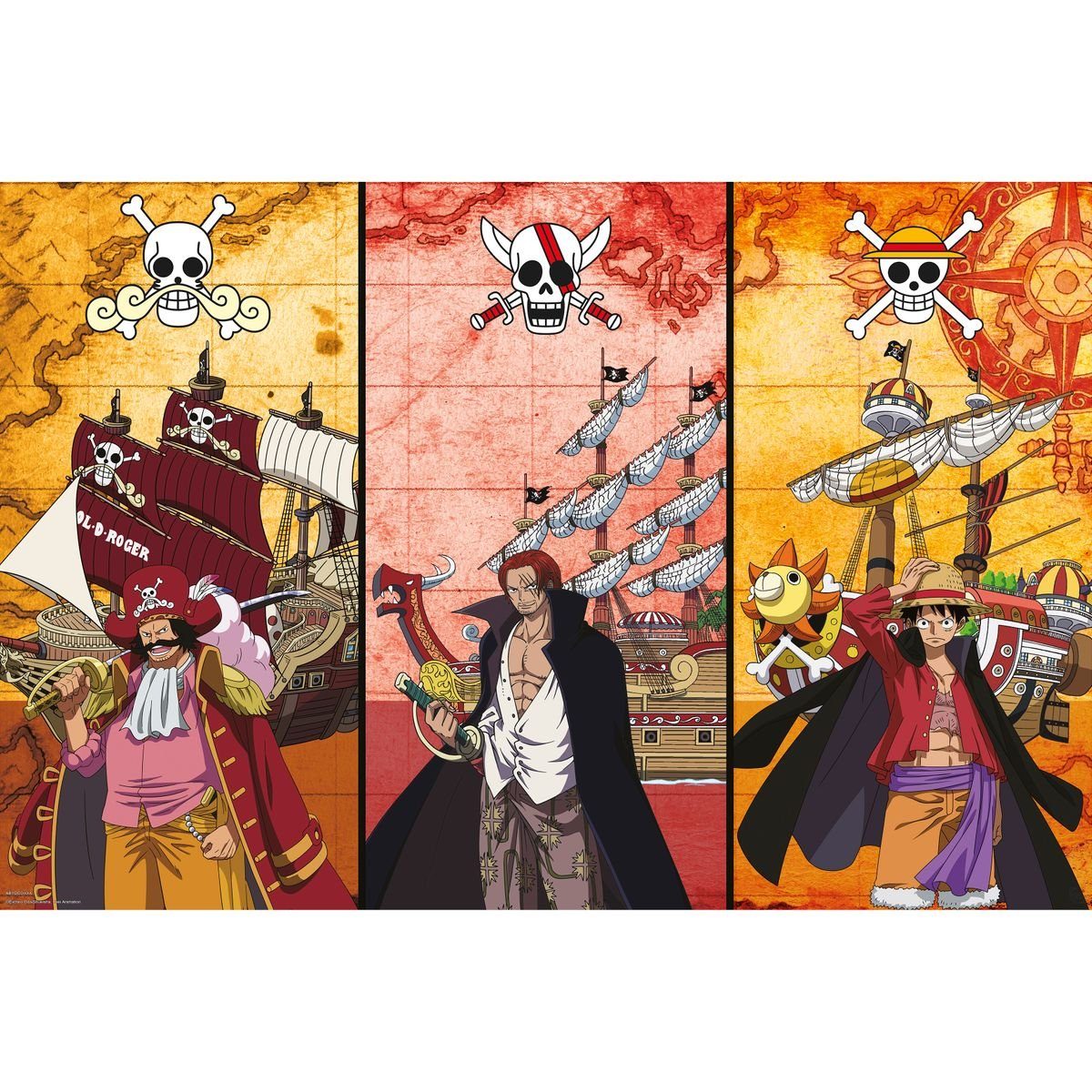 Das hochwertige Poster zeigt Gold D. Roger, Shanks und Ruffy.