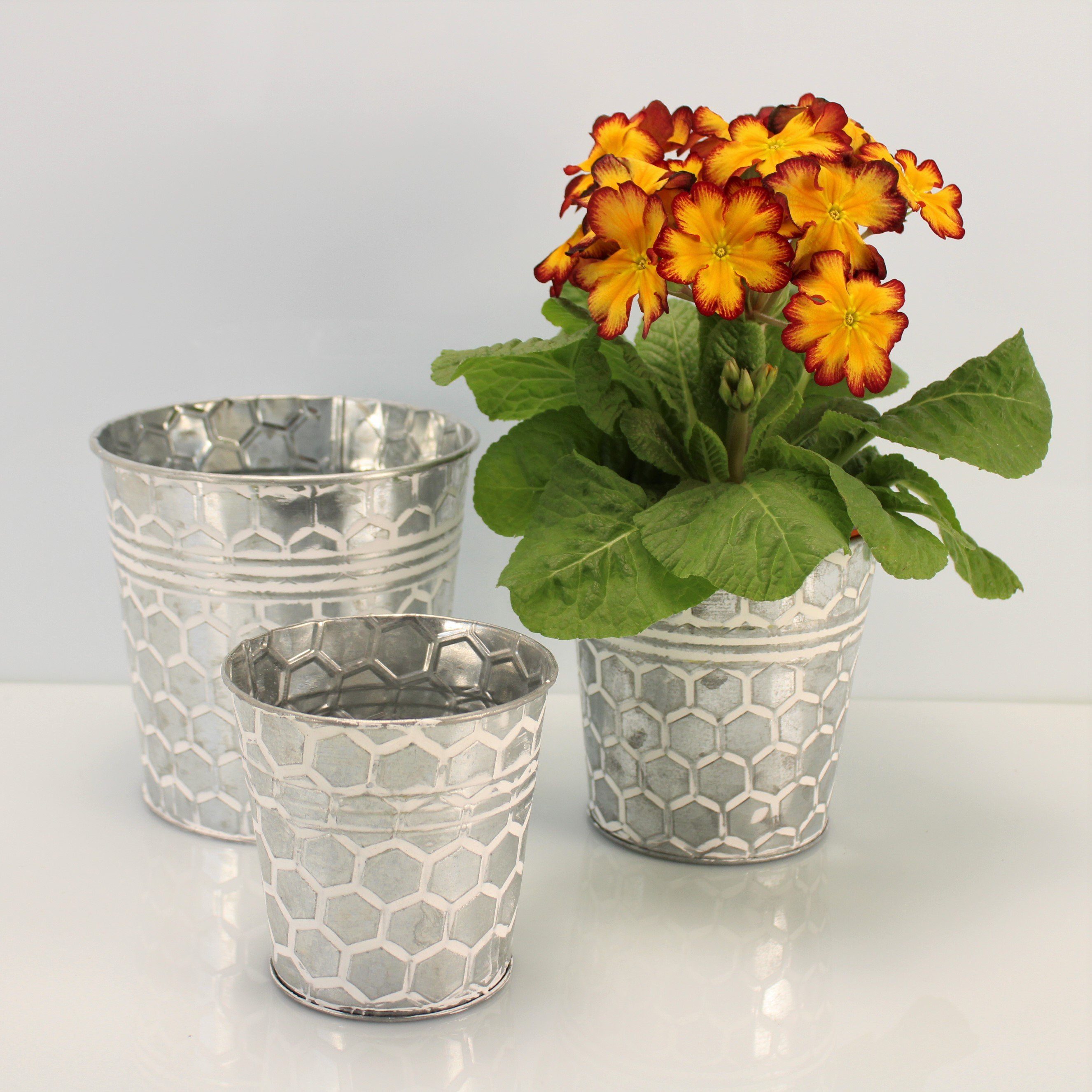 3 günstige Blumentöpfe im Set wählbar. Die silbernen Töpfe sind mit einem Wabenmuster geschmückt und im leichten Vintage Stil gehalten. Die weiße Farbe ist unregelmäßig/verwischt aufgebracht und verstärkt das Vintage Design. Mit frischen Kräutern oder bunten Blumen bepflanzt werden diese Blumentöpfe zum Hingucker auf der Terrasse, dem Balkon oder auch im Wohnraum. Höhe der Töpfe wahlweise ca. 10,5 cm, 12,5 cm und 14 cm. Durchmesser ca. 10 cm, 12 cm und 14 cm.