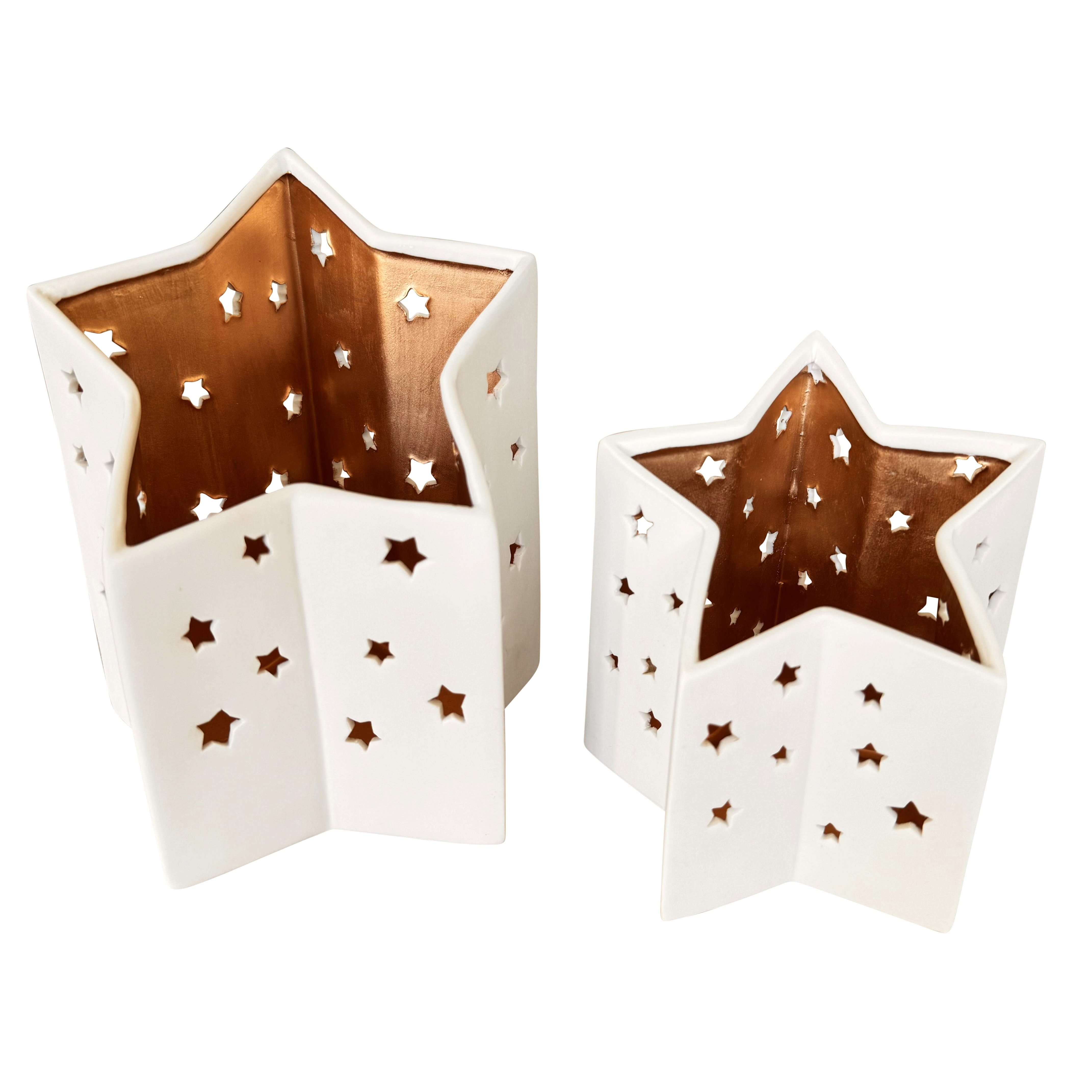 2 große Sterne aus Keramik gefertigt für Teelichter und Votivkerzen. Der Kerzenschein wird durch den Kupferton gekonnt in Szene gesetzt und scheint durch die Sternenausstanzungen.
