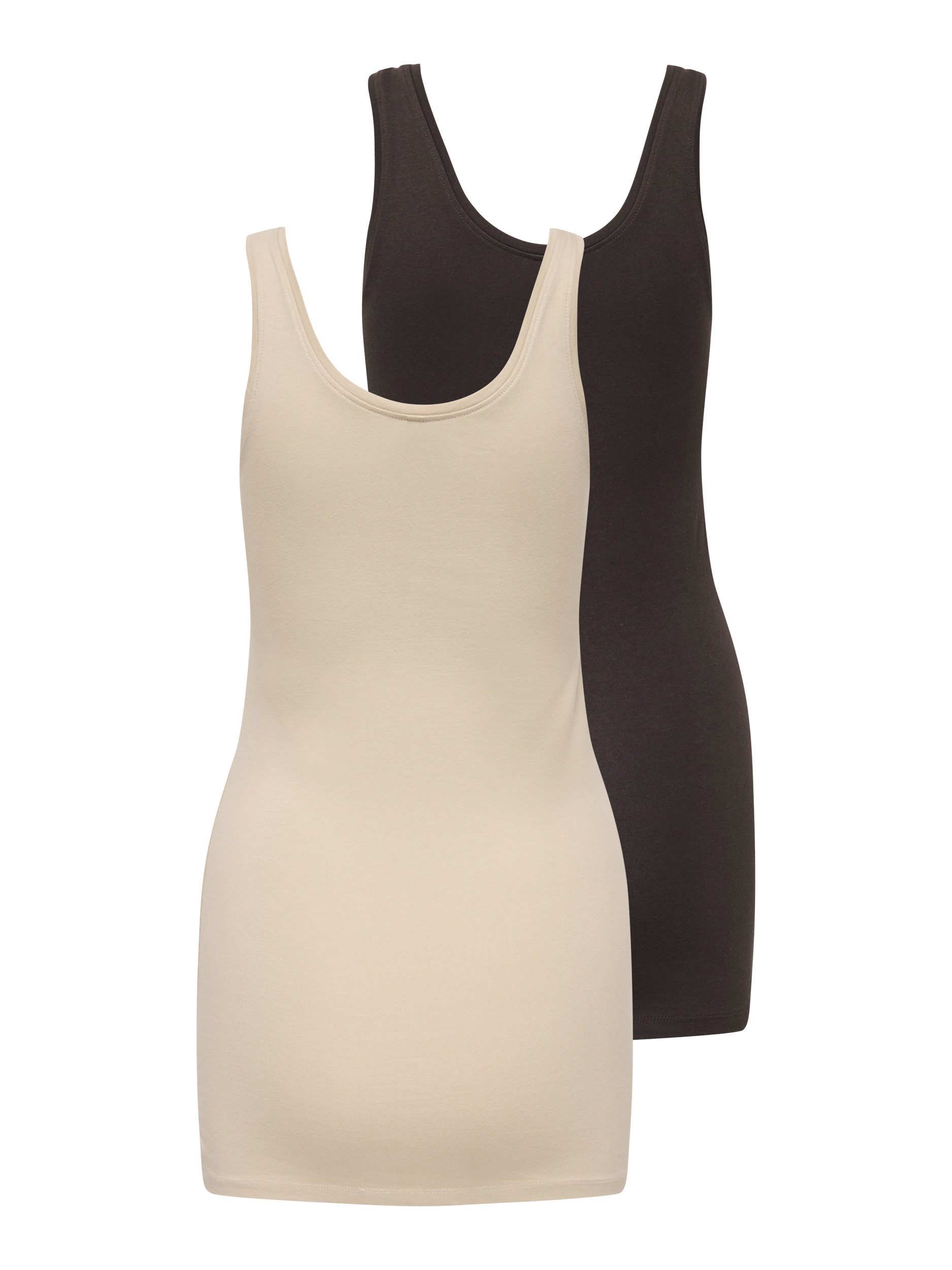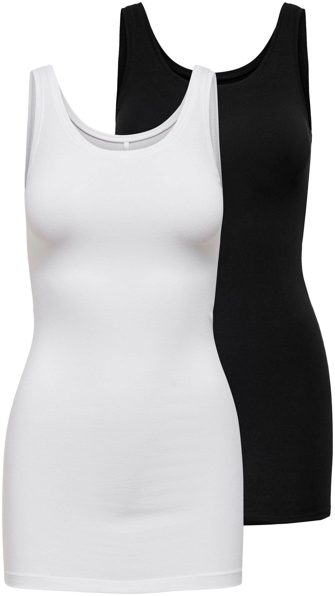 Gesucht und gefunden: Schau dir das Tanktop von ONLY mal genauer an. Dieses Top hat einen Rundhalsausschnitt und ist Po-bedeckend sowie schmal geschnitten, sodass es deine Silhouette betont.