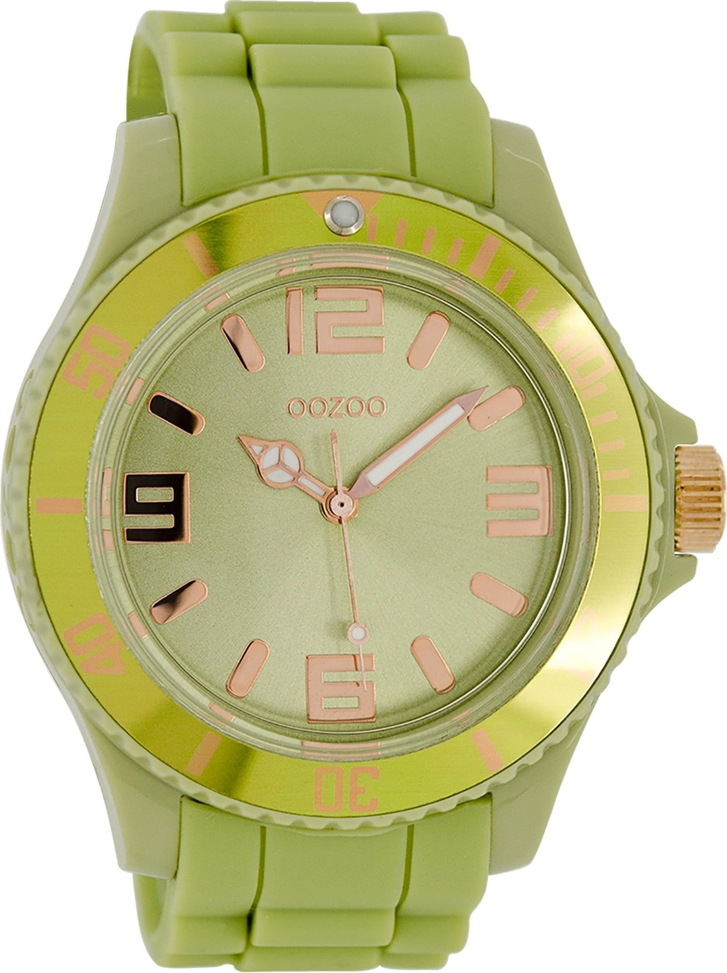 Die Fashion Uhr der Marke Oozoo hat ein schönes Armband aus Silikon in grün mit Dornschließe. Eine Uhr aus der Oozoo Timepieces Kollektion für Damen in der Gehäusefarbe grün mit Quarzwerk. Die Analoguhr mit Mineralglas hat ein Zifferblatt in der Farbe grün. Die Form der Uhr ist rund und das Gehäuse ist extra groß ca. 48mm.