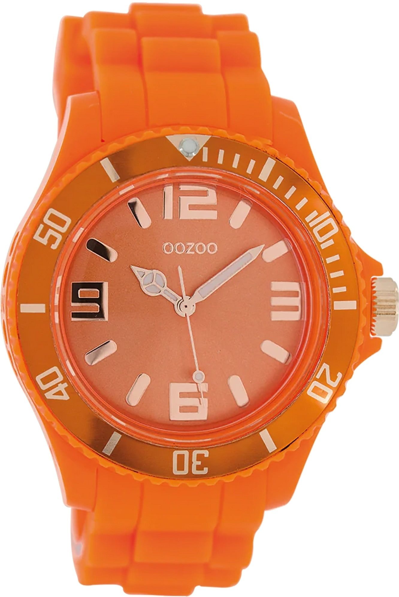 Die Fashion Uhr der Marke Oozoo hat ein schönes Armband aus Silikon in orange mit Dornschließe. Eine Uhr aus der Oozoo Timepieces Kollektion für Damen in der Gehäusefarbe orange mit Quarzwerk. Die Analoguhr mit Mineralglas hat ein Zifferblatt in der Farbe orange. Die Form der Uhr ist rund und das Gehäuse ist groß ca. 43mm.