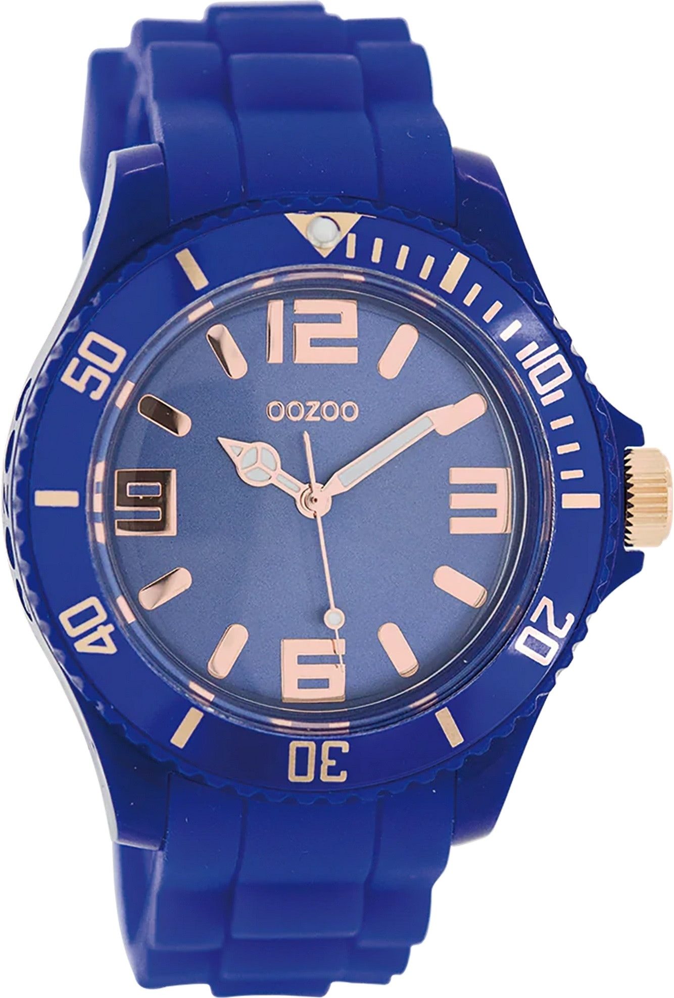 Die Fashion Uhr der Marke Oozoo hat ein schönes Armband aus Silikon in blau mit Dornschließe. Eine Uhr aus der Oozoo Timepieces Kollektion für Damen in der Gehäusefarbe blau mit Quarzwerk. Die Analoguhr mit Mineralglas hat ein Zifferblatt in der Farbe blau. Die Form der Uhr ist rund und das Gehäuse ist groß ca. 43mm.