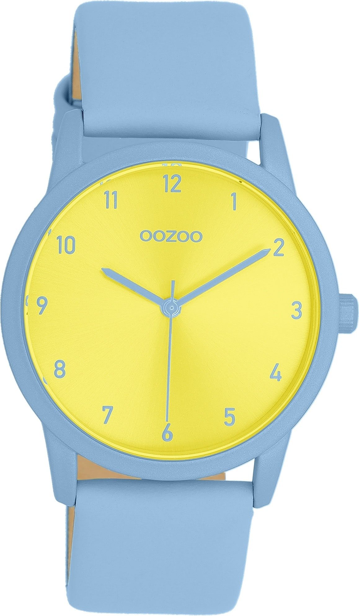 Die Casual Uhr der Marke Oozoo hat ein schönes Armband aus Leder in hellblau mit Dornschließe. Eine Uhr aus der Timepieces Kollektion für Damen in der Gehäusefarbe hellblau mit Quarzwerk. Die Analoguhr mit Mineralglas hat ein Zifferblatt in der Farbe gelb. Die Form der Uhr ist rund und das Gehäuse ist mittel ca. 38mm.