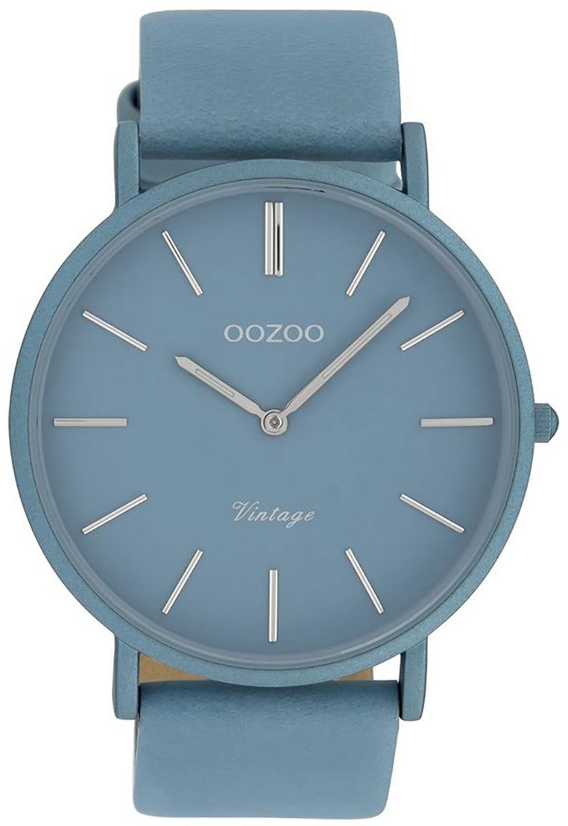 Die Fashion Uhr der Marke Oozoo hat ein schönes Armband aus Leder in hellblau mit Dornschließe. Eine Uhr aus der Oozoo Vintage Series Kollektion für Damen in der Gehäusefarbe hellblau mit Quarzwerk. Die Analoguhr mit Mineralglas hat ein Zifferblatt in der Farbe hellblau silber. Die Form der Uhr ist rund und das Gehäuse ist groß ca. 44mm.