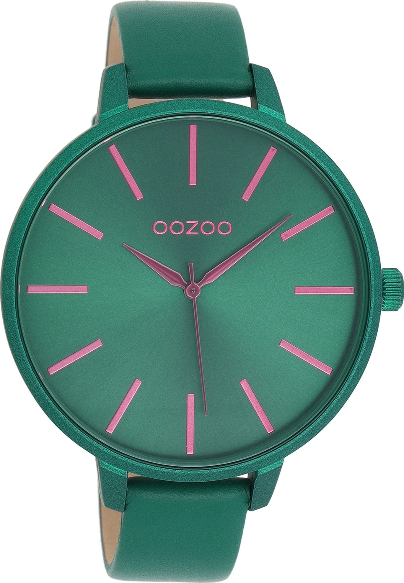 Die Fashion Uhr der Marke Oozoo hat ein schönes Armband aus Leder in grün mit Dornschließe. Eine Uhr aus der Oozoo Timepieces Kollektion für Damen in der Gehäusefarbe grün mit Quarzwerk. Die Analoguhr mit Mineralglas hat ein Zifferblatt in der Farbe grün türkis. Die Form der Uhr ist rund und das Gehäuse ist extra groß ca. 48mm.