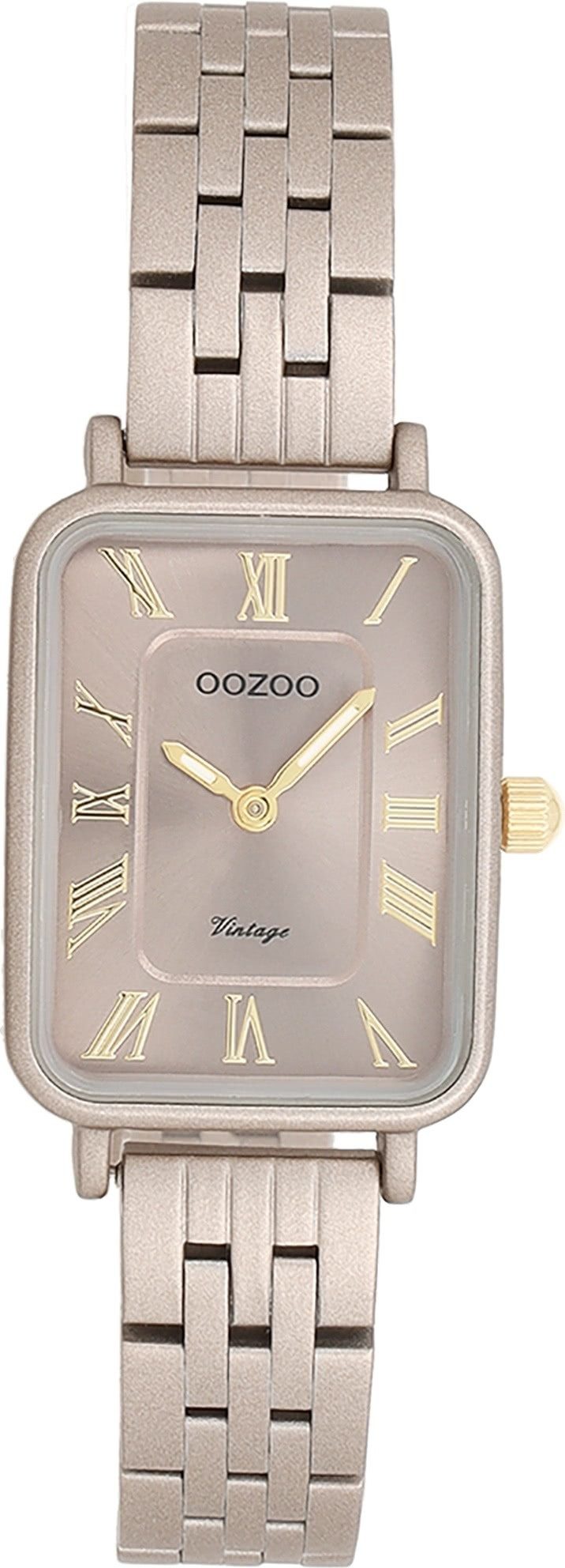 Die Fashion Uhr der Marke Oozoo hat ein schönes Armband aus Metall in taupe braun mit Schiebeverschluss. Eine Uhr aus der Oozoo Vintage Series Kollektion für Damen in der Gehäusefarbe taupe braun mit Quarzwerk. Die Analoguhr mit Mineralglas hat ein Zifferblatt in der Farbe taupe braun. Die Form der Uhr ist rechteckig und das Gehäuse ist extra groß ca. 24x28mm.