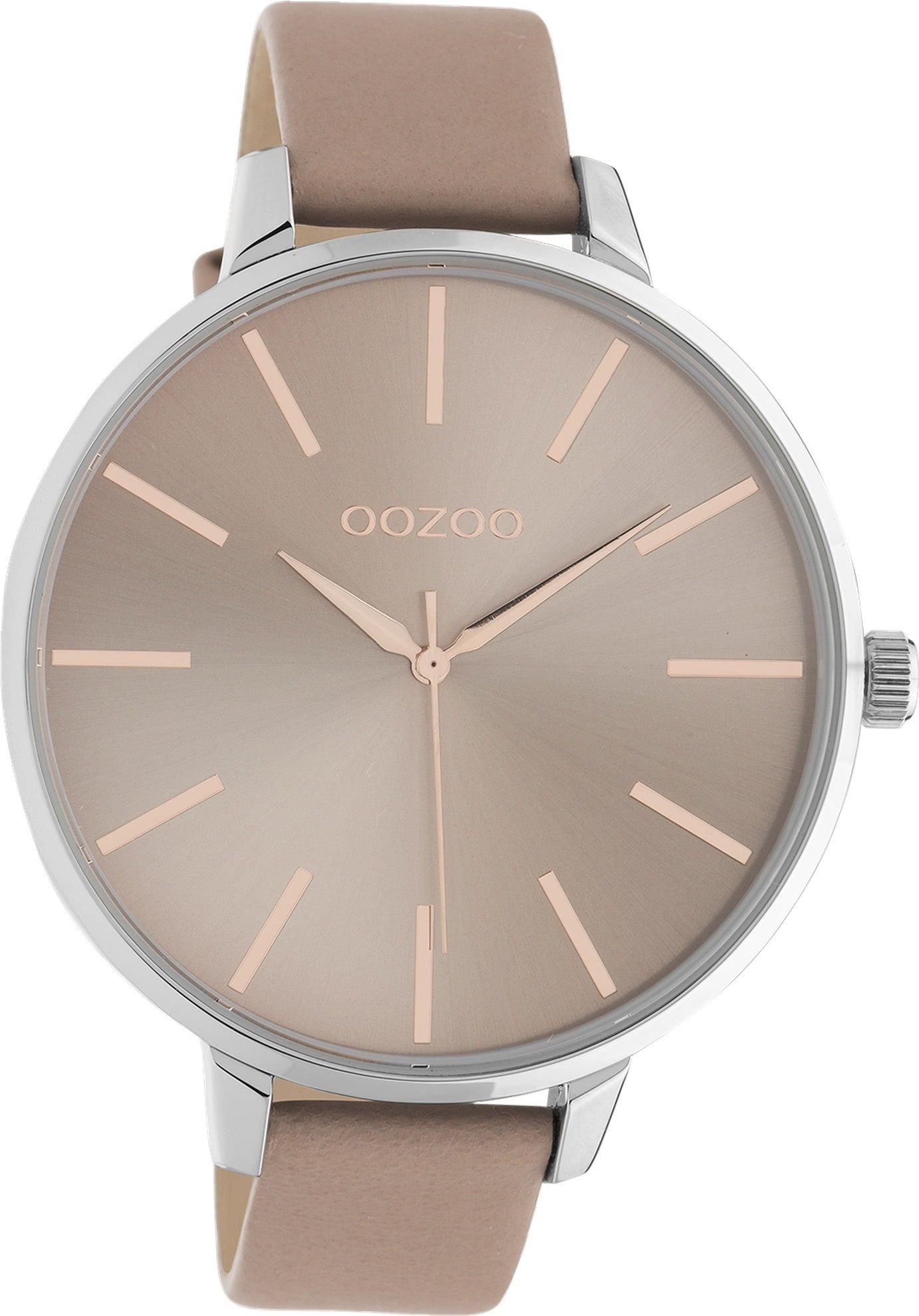 Die elegante Uhr der Marke Oozoo hat ein schönes Armband aus Leder, in pinkgrau, mit Dornschließe. Diese Uhr aus der Oozoo Timepieces Kollektion für Damen besitzt ein silberfarbenes Gehäuse mit Quarzwerk. Die Analoguhr mit Mineralglas hat ein Ziffernblatt in braun. Die Form der Uhr ist rund und das Gehäuse ist ca. 48mm groß.