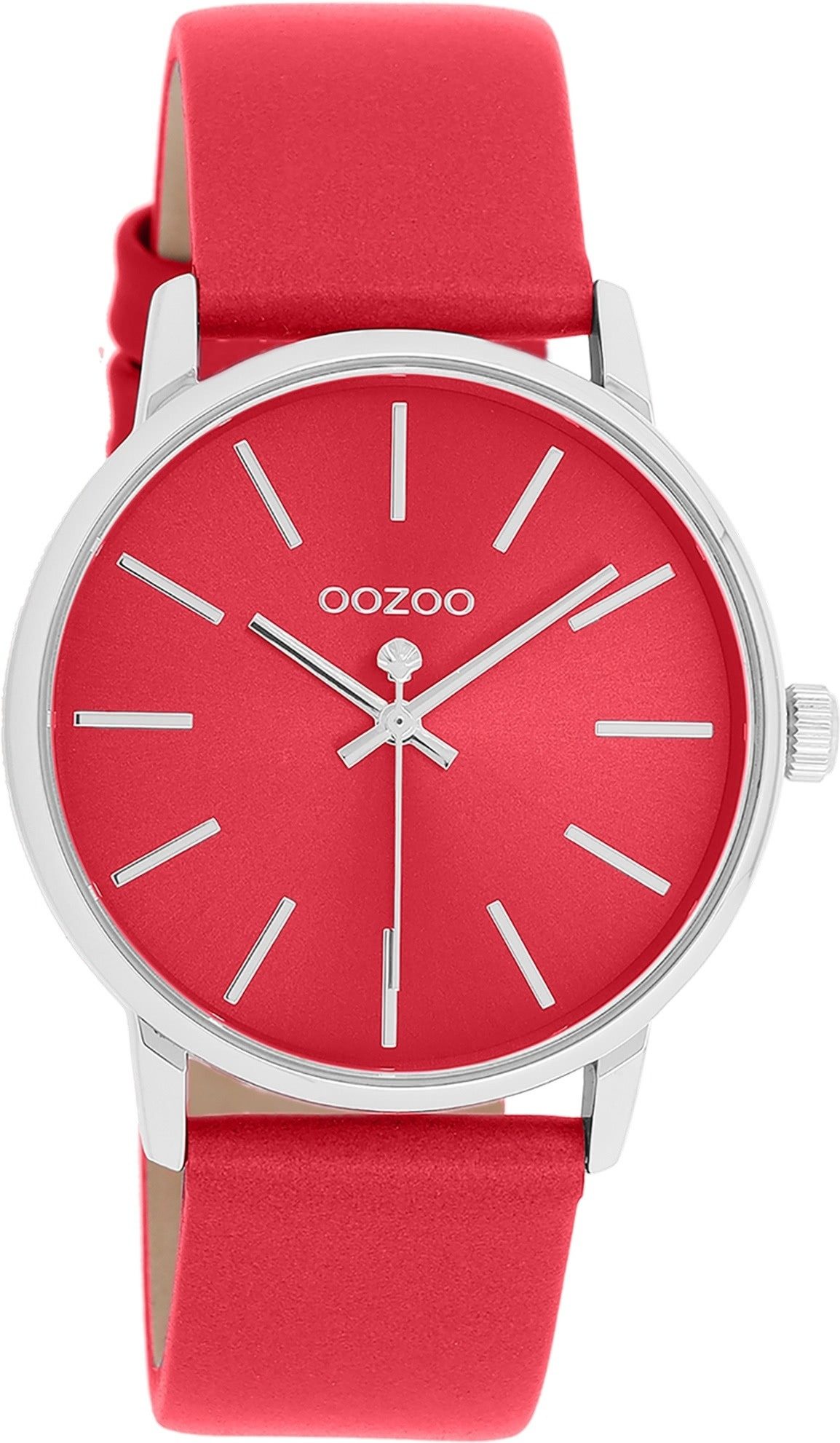 Die Casual Uhr der Marke Oozoo hat ein schönes Armband aus Leder in rot mit Dornschließe. Eine Uhr aus der Timepieces Kollektion für Damen in der Gehäusefarbe silberfarben mit Quarzwerk. Die Analoguhr mit Mineralglas hat ein Zifferblatt in der Farbe rot. Die Form der Uhr ist rund und das Gehäuse ist mittel ca. 36mm.