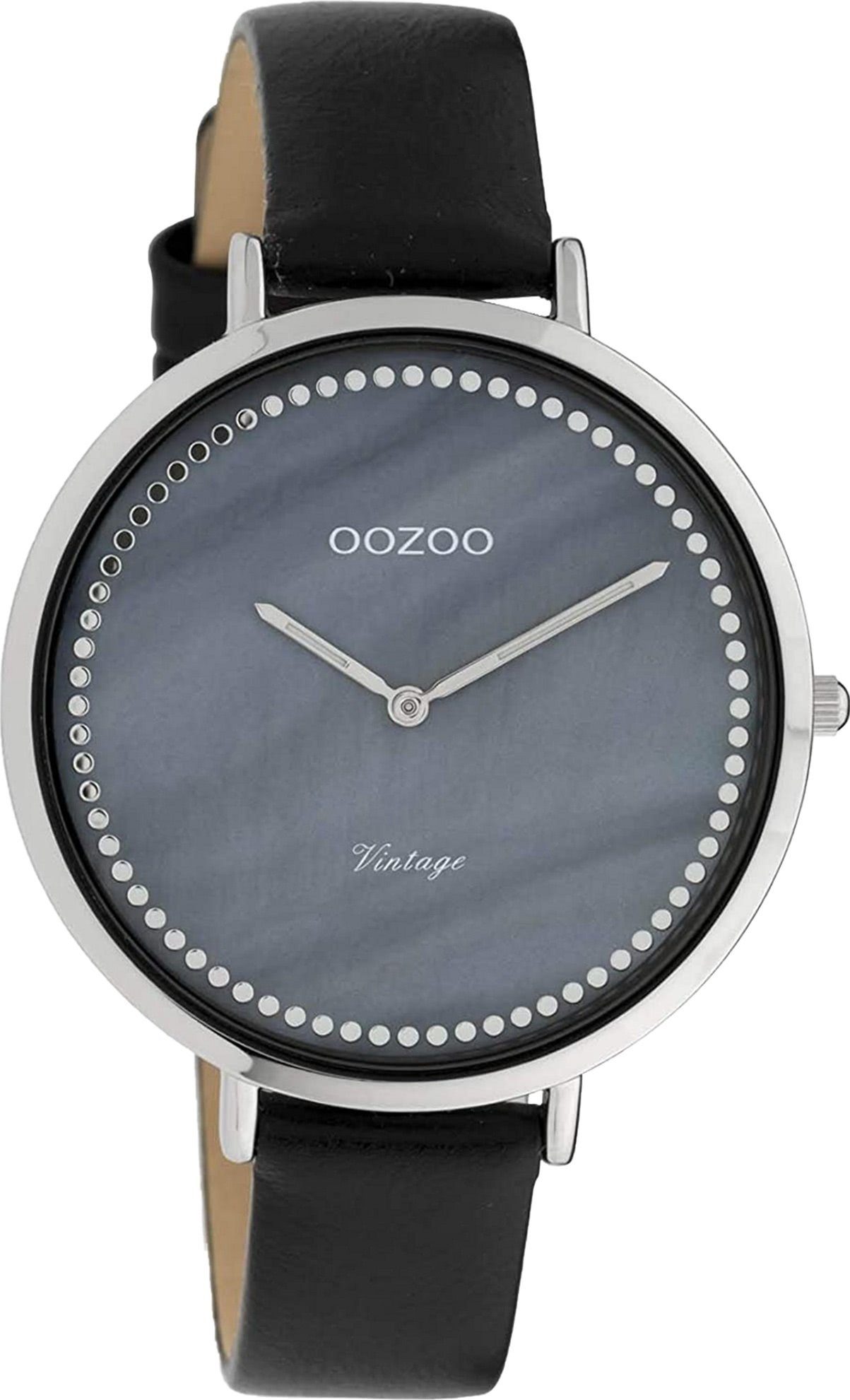 Die Fashion Uhr der Marke Oozoo hat ein schönes Armband aus Leder in schwarz mit Dornschließe. Eine Uhr aus der Oozoo Vintage Series Kollektion für Damen in der Gehäusefarbe silber mit Quarzwerk. Die Analoguhr mit Mineralglas hat ein Zifferblatt in der Farbe schwarz. Die Form der Uhr ist rund und das Gehäuse ist groß ca. 40mm.