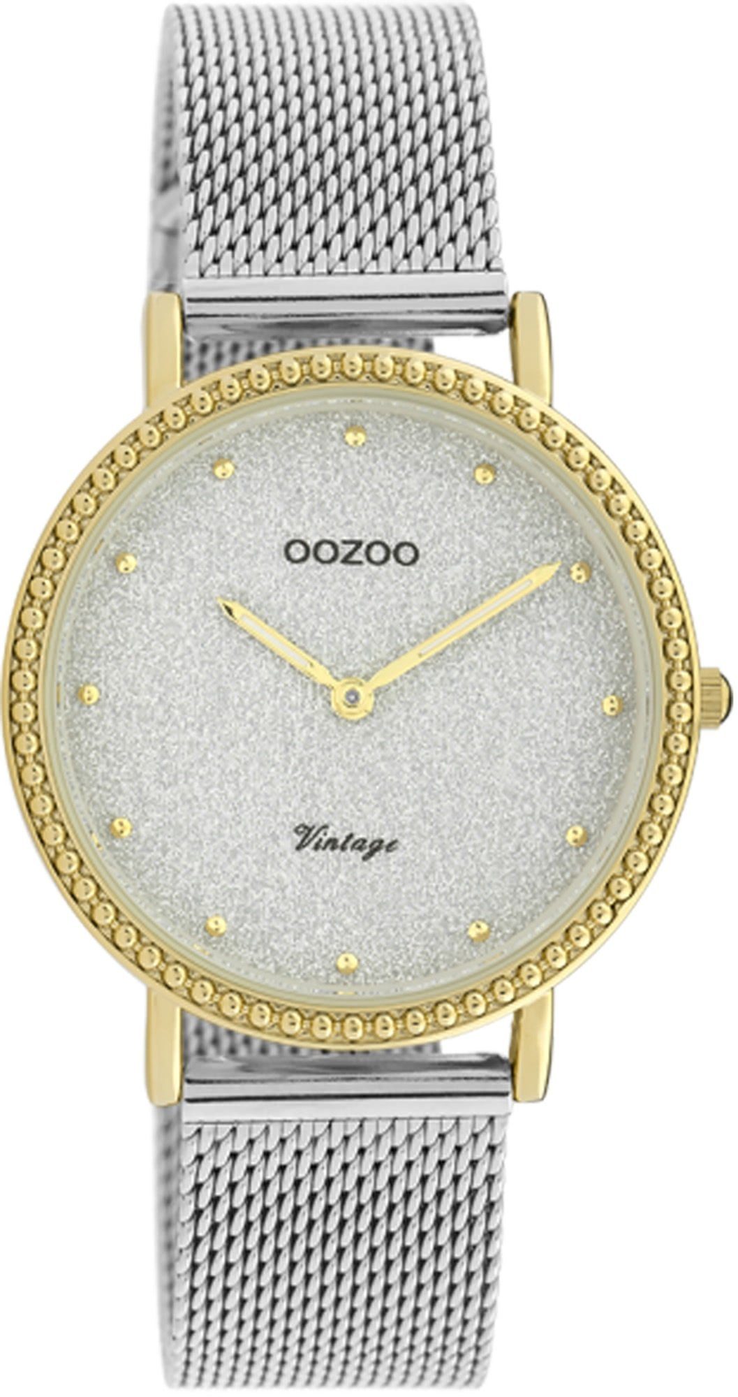 Die Fashion Uhr der Marke Oozoo hat ein schönes Armband aus Edelstahl in silber mit Klappverschluss. Eine Uhr aus der Oozoo Vintage Series Kollektion für Damen in der Gehäusefarbe gold mit Quarzwerk. Die Analoguhr mit Mineralglas hat ein Zifferblatt in der Farbe silber. Die Form der Uhr ist rund und das Gehäuse ist mittel ca. 34mm.