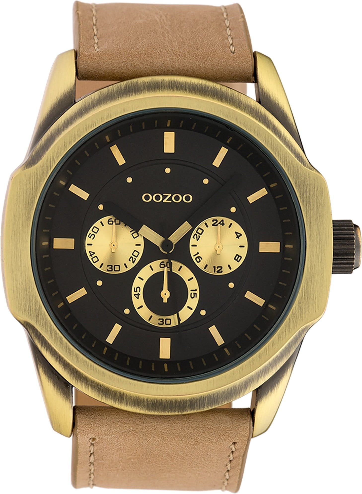 Die Fashion Uhr der Marke Oozoo hat ein schönes Armband aus Leder in hellbraun mit Dornschließe. Eine Uhr aus der Oozoo Timepieces Kollektion für Damen in der Gehäusefarbe gold mit Quarzwerk. Die Analoguhr mit Mineralglas hat ein Zifferblatt in der Farbe schwarz gold. Die Form der Uhr ist rund und das Gehäuse ist extra groß ca. 48mm.